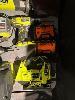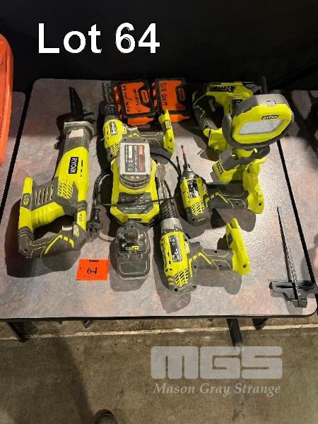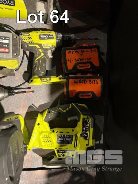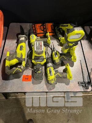 THE RYOBI SET INCLUDING CORDLESS POWER TOOLS, RECIPRO SAW, 2 x HAND DRILLS, TEK GUN, JIGSAW, WORKLIGHT, LED, BATTERY CHARGER, 2 x BATTERIES, 2 x DRILL SETS, WOOD & STEEL