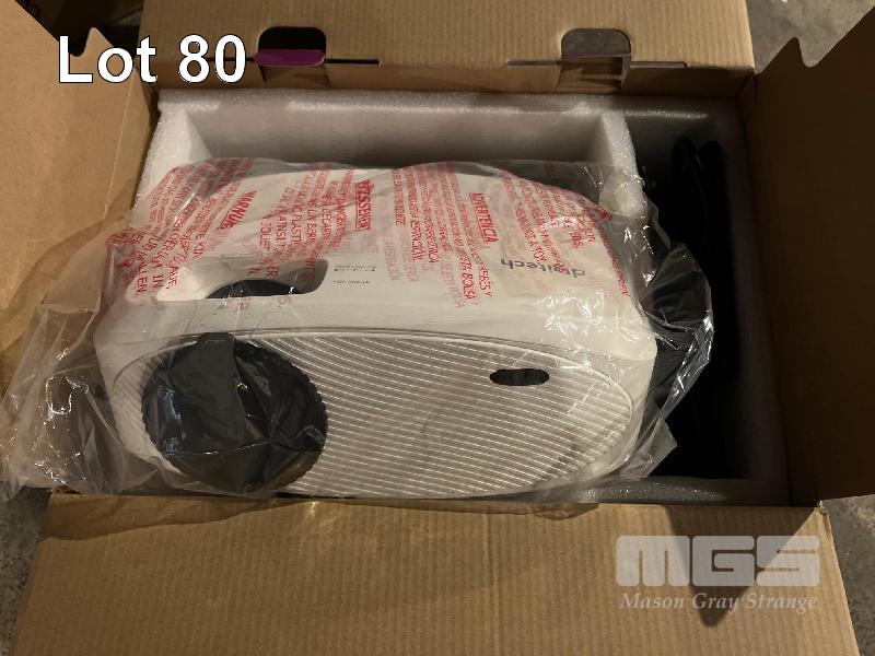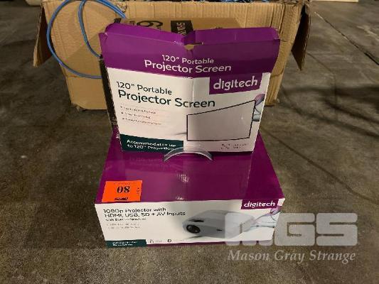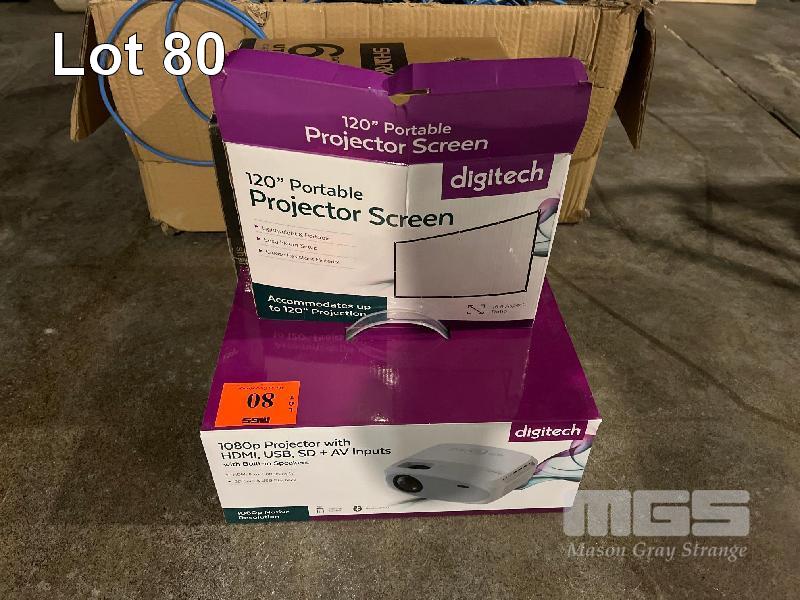 DIGITECH 1080P PROJECTOR, NEW IN BOX WITH 120" PORTABLE PROJECTOR SCREEN, PART ROLL CAT 6 & 1 x BOX ASSORTED CAT 6 CABLE