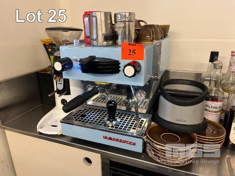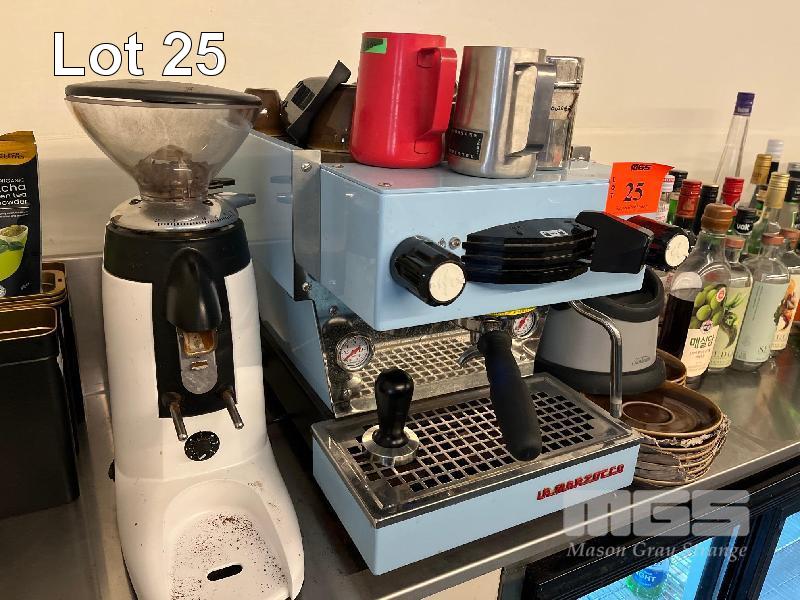 LA MARZOCCO ESPRESSO MACHINE, SINGLE GROUP HEAD, SINGLE STEAMER, MODEL: LINEAMINI, DOM: 2022, 240V 10AMP PLUG BOOKLET INCLUDED COMPAK BEAN GRINDER, MODEL: M0039 MW MATTWHITE, DOM: 2021, 240V 10AMP PLUG ASSORTED COFFEE CUPS & SAUCERS INCLUDED