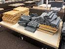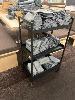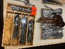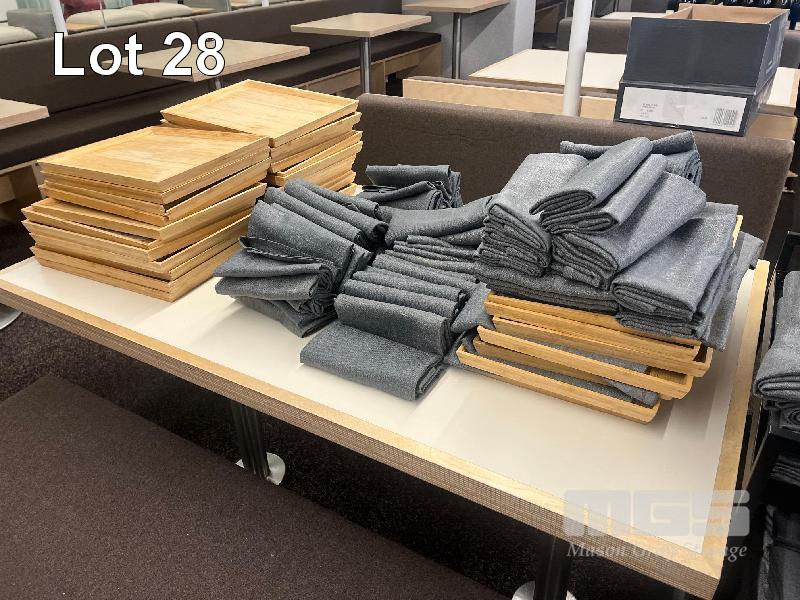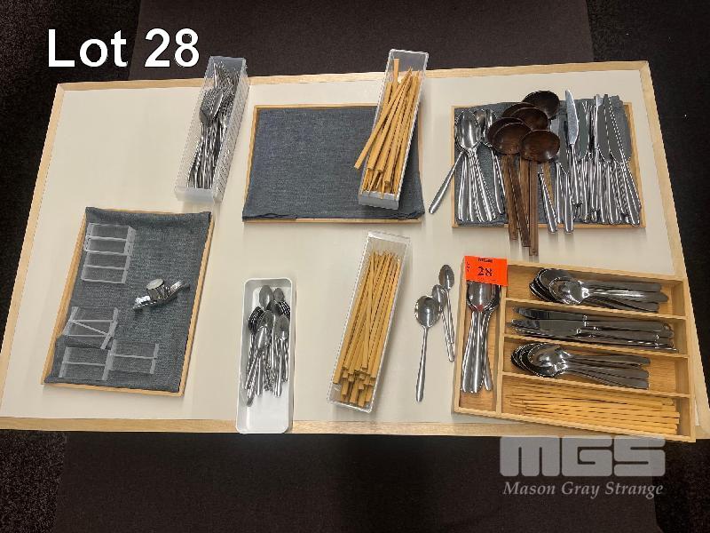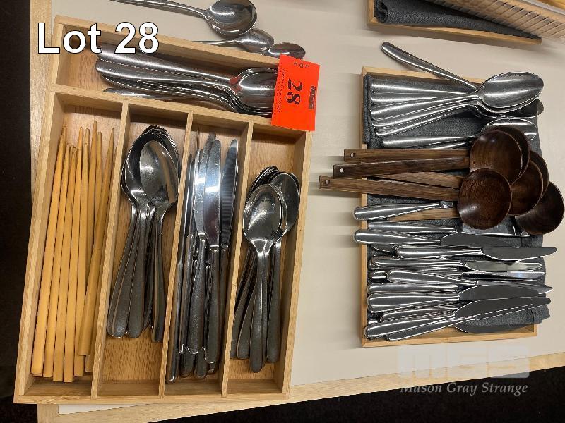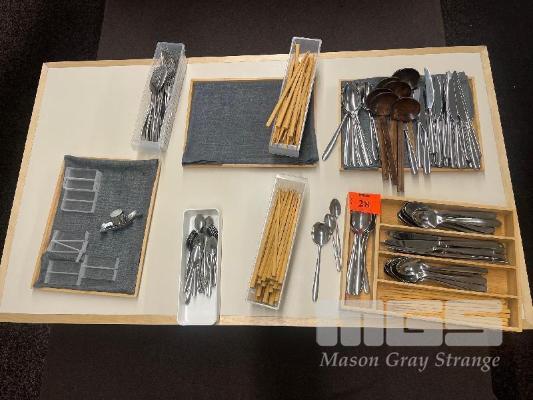 TABLE KRAFT CUTLERY SET COMPRISING 28 x FORKS 46 x PAIRS CHOPSTICKS 44 x SPOONS 20 x TEASPOONS 29 x KNIVES 6 x TIMBER LADLES 20 x TIMBER TRAYS, 300 x 200mm LARGE QUANTITY BLUE/GREY CLOTH NAPKINS & 3 TIER TROLLEY