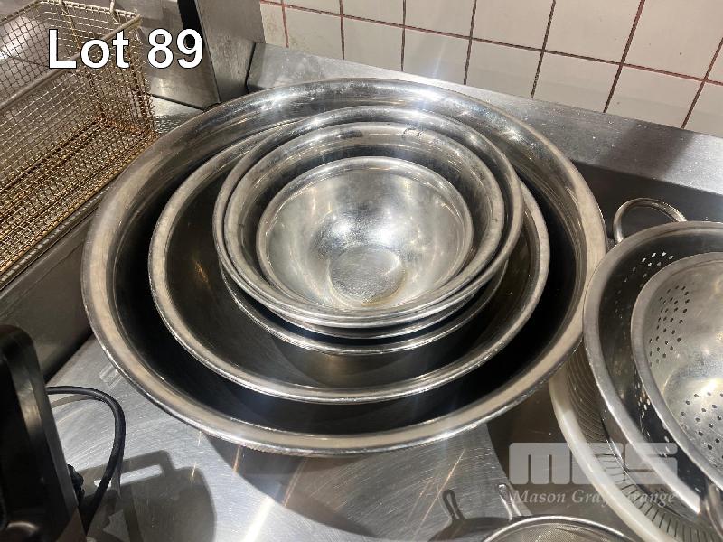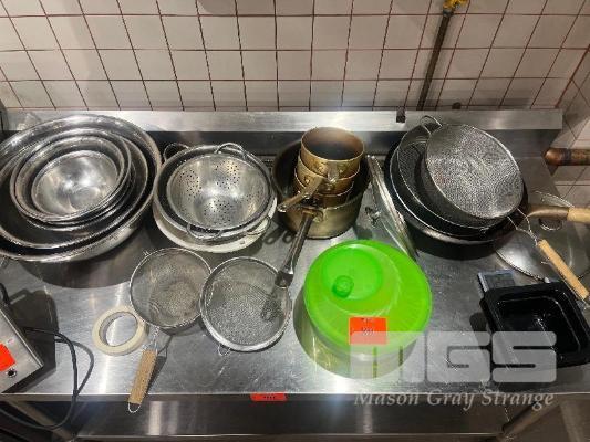 12 x ASSORTED SIZE STAINLESS STEEL BOWLS, 20 - 45cm (D), ASSORTED COLANDERS, WOKS, ASSORTED KITCHEN SUNDRIES