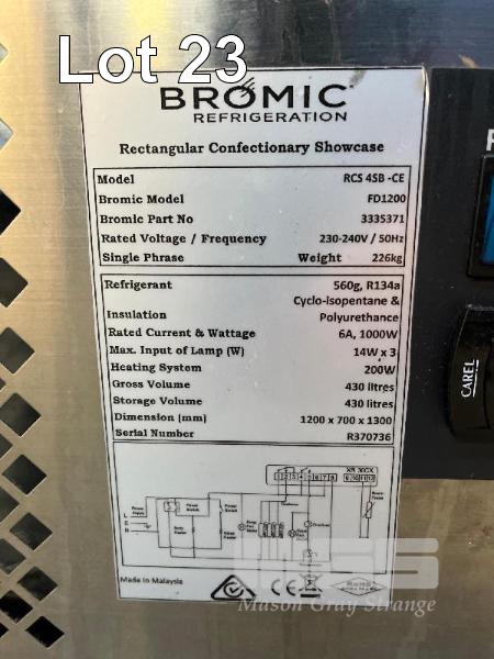 BROMIC REFRIGERATED SHOWCASE, SLIDING DOORS, ILLUMINATED, DIGITAL DISPLAY MOD: RCS 4SB-CE (FD1200) 430L CAP 1200 x 700 x 1300mm 240V
