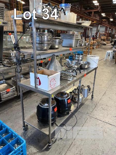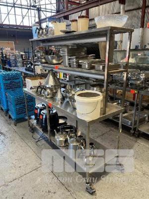 MOBILE STAINLESS STEEL BENCH, 2 TIER, LOCKING CASTOR WHEELS 1800 x 600 x 900mm WITH 2 TIER SHELF, 2 x ROBAND HEAT LAMPS, 240V 10AMP PLUG