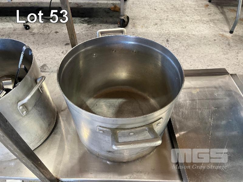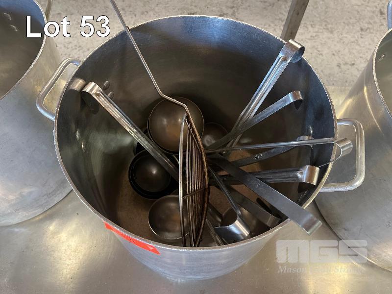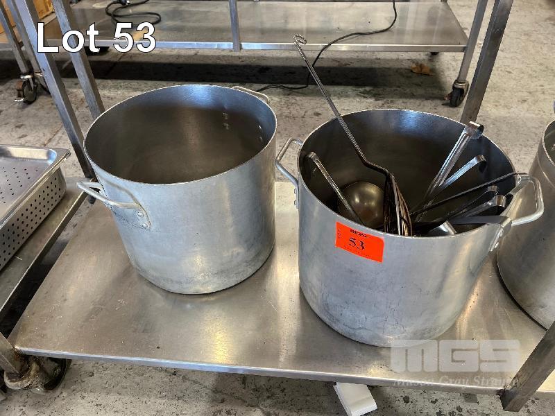 3 x LARGE ALLOY STOCK POTS, APPROX 15L WITH 9 x ASSORTED LADLES
