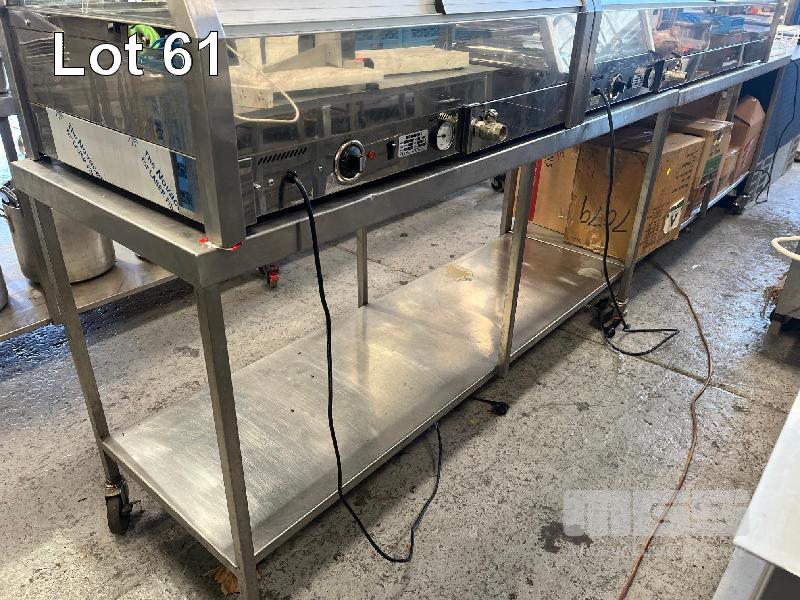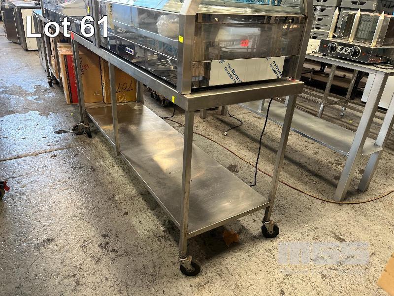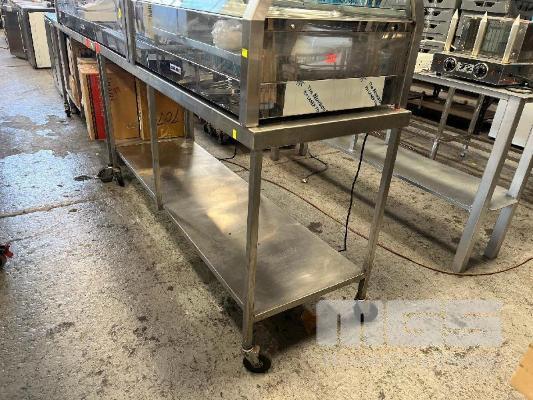 STAINLESS STEEL MOBILE PREP BENCH, 2 TIER, LOCKING CASTOR WHEELS, 1800 x 600 x 900mm