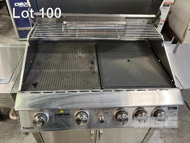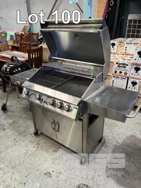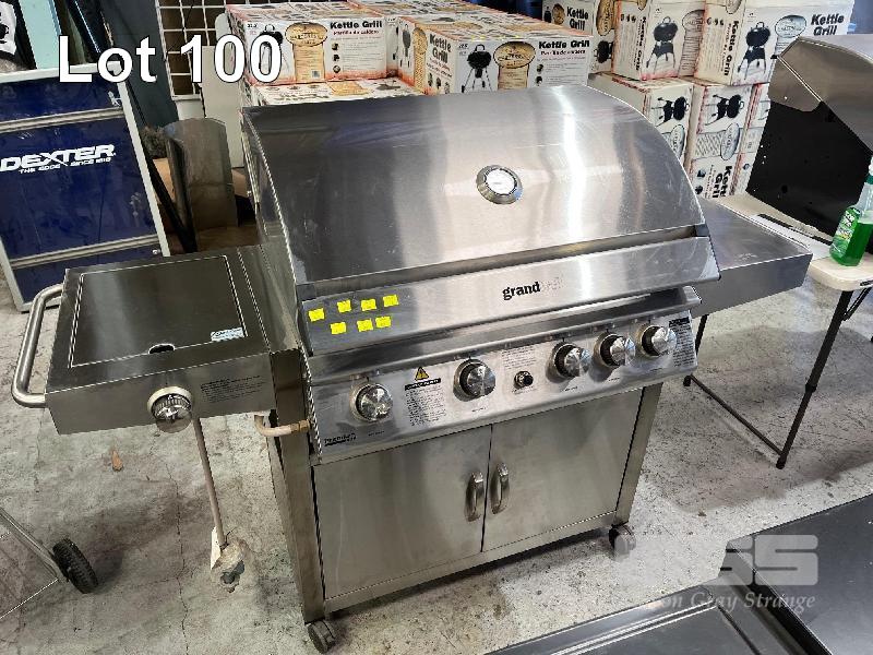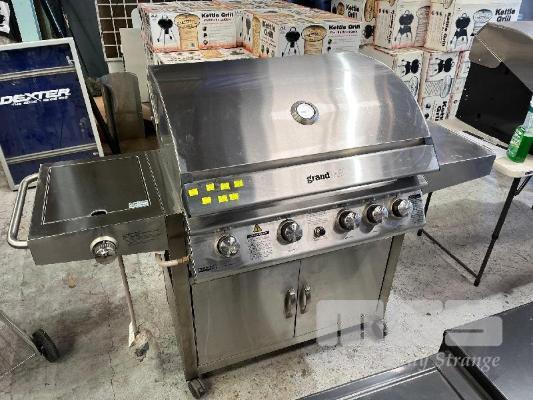 GRANDHALL PREMIUM 4S MOBILE STAINLESS STEEL COVERED GAS BBQ ON CABINET TROLLEY. FEATURES STAINLESS STEEL HOOD, 2-DOOR STAINLESS STEEL CABINET TROLLEY WITH 4-BURNERS PLUS BACK-BURNER, SIDEBURNER & ELECTRONIC IGNITION. MOD: 1001SPP NEW IN BOX (2 x BOXES). ORP $1,599