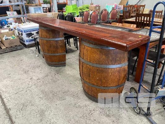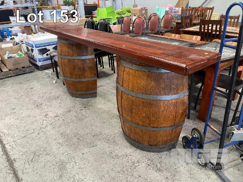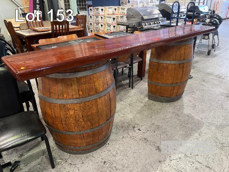 WALL MOUNT TIMBER BAR, HALF WINE BARREL LEGS, 2700 x 400 x 1050mm (H)