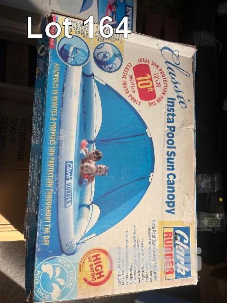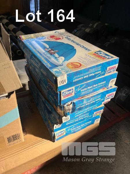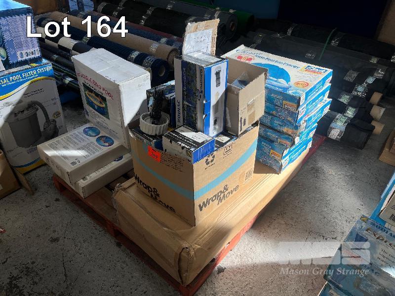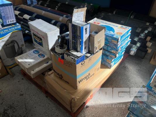 CONTENTS OF PALLET, QUANTITY OF POOL ACCESSORIES, SUNCANOPIES, INFLATABLE POOL ROOM 10ft, 15ft POOL LINER, ZODIAC CHLORINATOR REPLACMENT CELLS