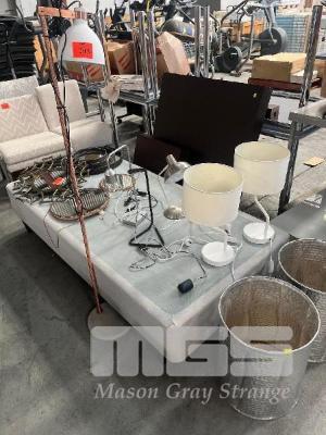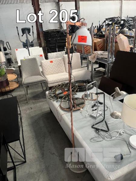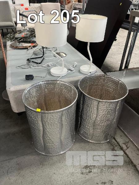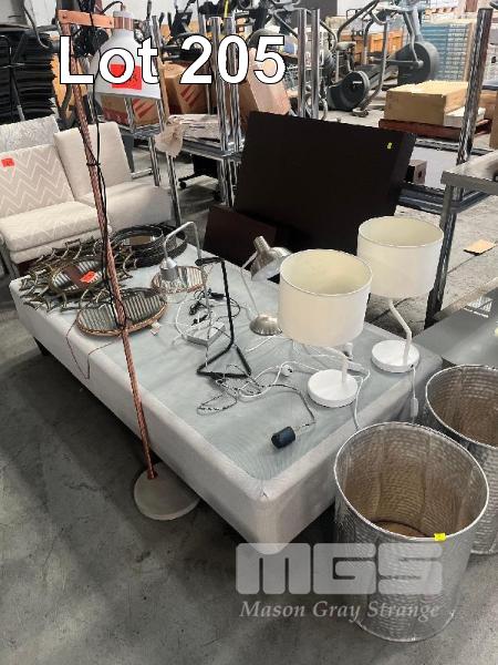 6 x ASSORTED DECORATIVE LAMPS, 2 x CHROME STORAGE CONTAINERS, TIMBER BASE, 450mm (H), 370mm (D)
