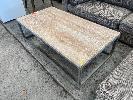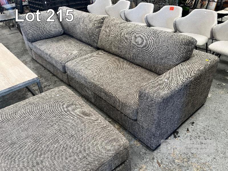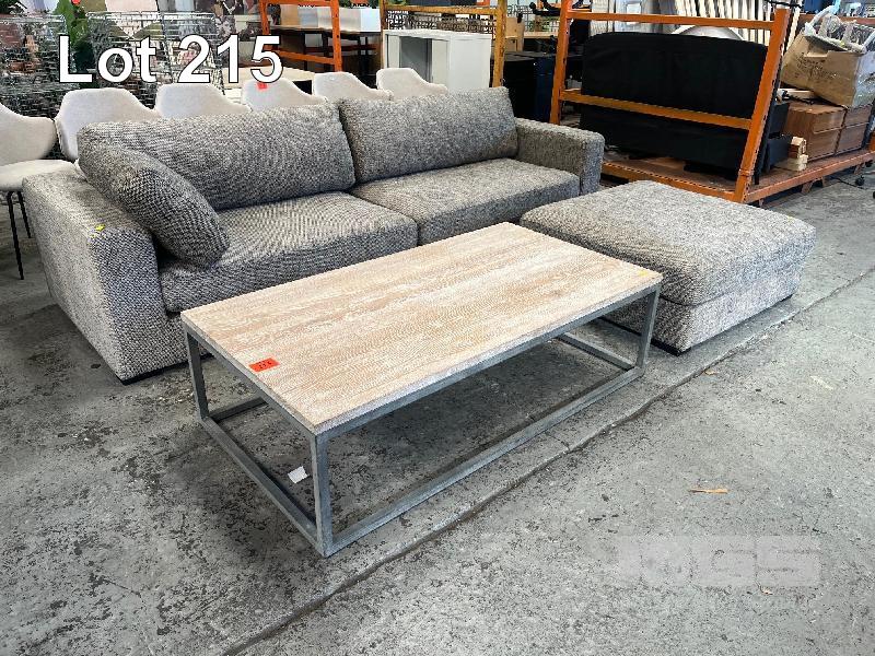 4 SEATER GREY CLOTH LOUNGE, 2900mm (L) WITH MATCHING OTTOMAN, 1000 x 1000mm TIMBER TOP STEEL FRAME COFFEE TABLE, 1500 x 800mm
