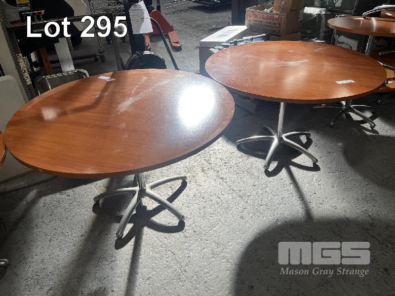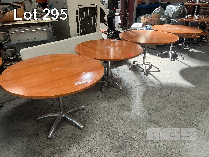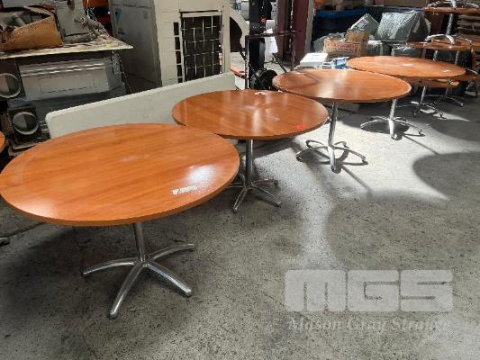 4 x CIRCULAR TIMBER TIMBER TOP TABLES, CHROME FRAME, 1100mm (D) 700mm (H)