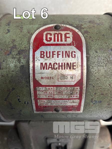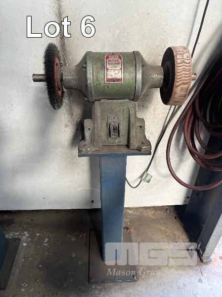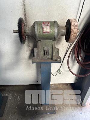 GMF DOUBLE ENDED BUFF, 8" 240V, ON PEDESTAL WITH WIRE BRUSH & FLAP WHEEL