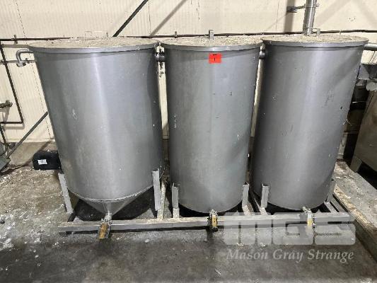 3 x FLOTATION TANKS, STAINLESS STEEL EACH 400 LITRE APPROX WITH VALVES ON SKID BAASE