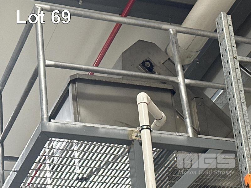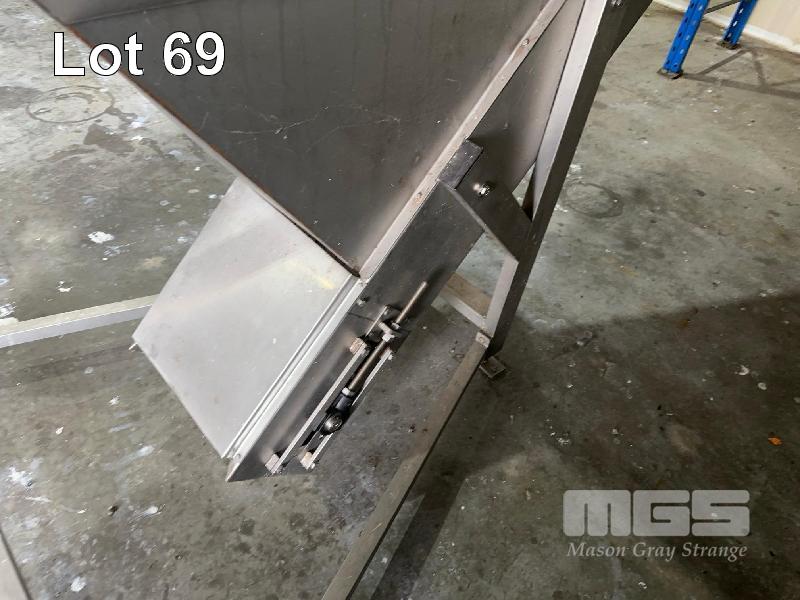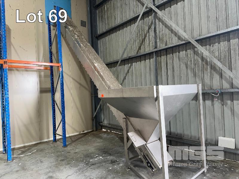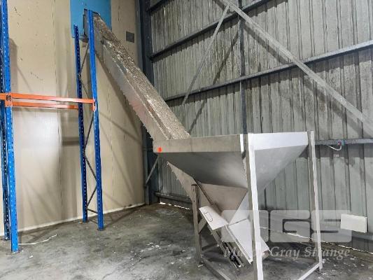 HOPPER DELIVERY ELEVATED CONVEYOR, DESARROLLOS TECNO BANDO MOD: ELR-400 DOM: 2007 STAINLESS STEEL CASED SLAT PVC CONVEYOR, 300mm 7000mm APPROX 415V REDUCTION DRIVE MOTOR TO INCLUDE WASH TANK-V BUTTON