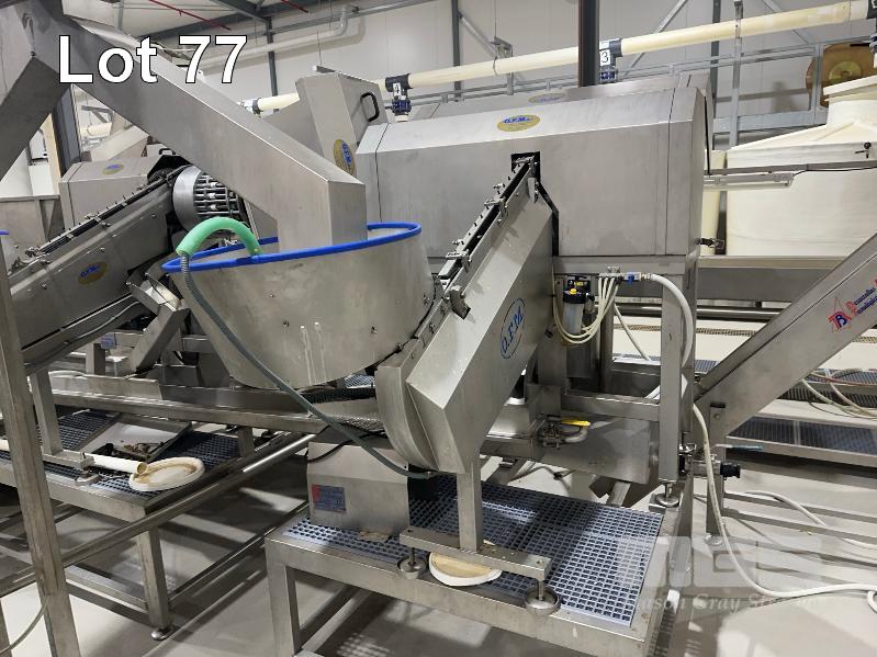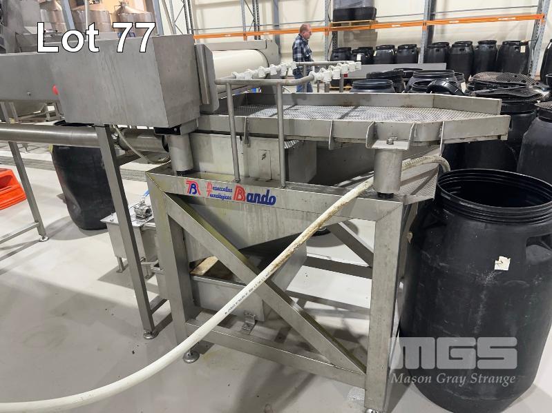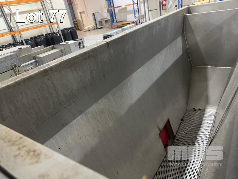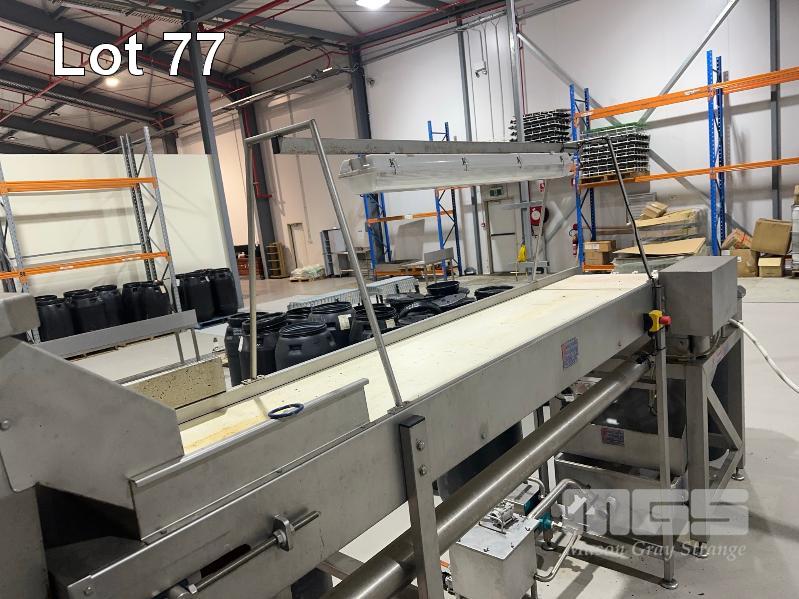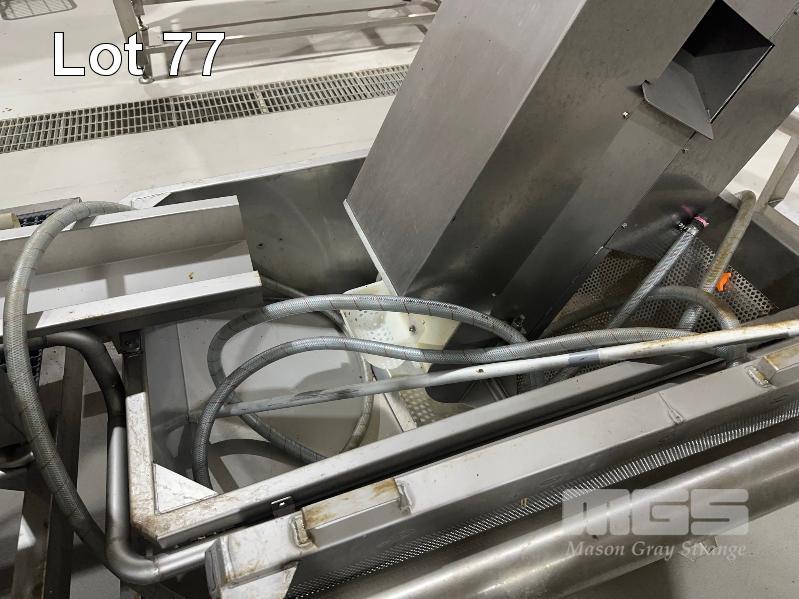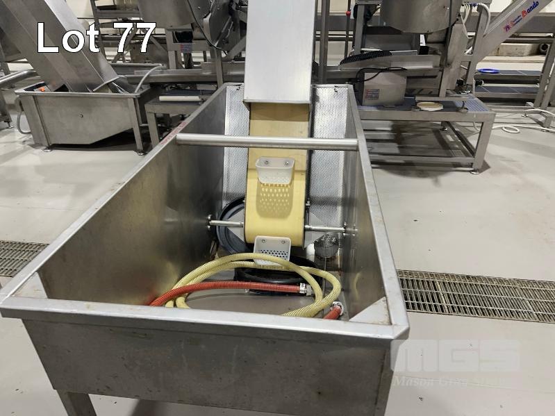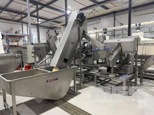PITTING SLICING LINE, DTB STAINLESS FLOODED ELEVATOR & DELIVERY HOPPER 300mm, STAINLESS STEEL CLAD, DTB MOD: ELC300RED WITH DUAL OUTLET CHUTES TO DTB, O.F.M 2 x PITTING SLICERS, MOD: TBMORA-41 & TBP5151 TO STAINLESS STEEL HOPPER TANK & BUCKET ELEVATOR MOD: ELC300RED WITH TANK CIRCULATION PUMP TO STAINLESS STEEL DENSIMETER TANK MOD: DSS70 WITH CIRCULATION PUMP TO FLAT BELT INSPECTION CONVEYOR MOD: CI600LU TO FINAL RINSE & DELIVERY STATION WITH WATER RECOVERY TO INCLUDE SWITCHBOARD
