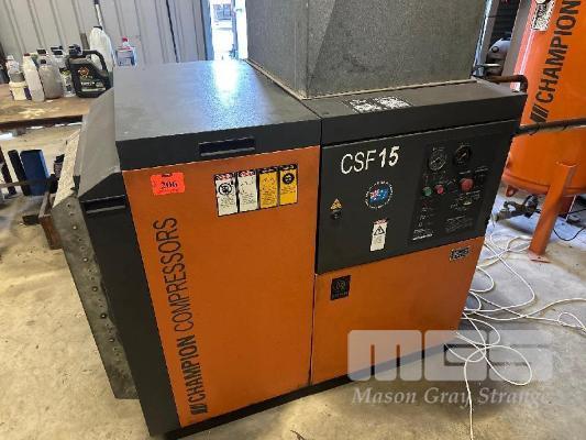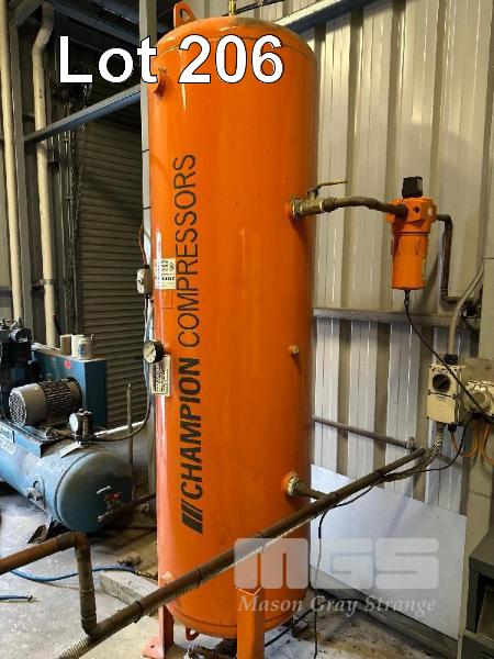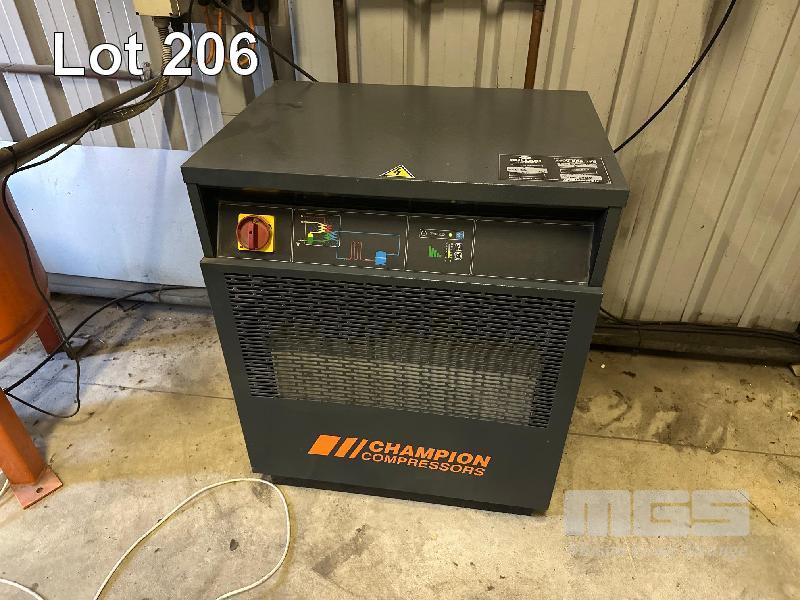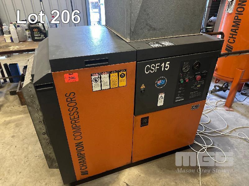 PACKAGED AIR COMPRESSOR, CHAMPION MOD: CSF15 S/NO: 6780 DOM: 2000 780 KPA 15kw, 415V & CHAMPION AIR DRYER MOD: CRD106 R134a GAS, 415V & VERTICAL AIR TANK WITH FILTERS TO FIRST JUNCTION