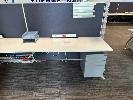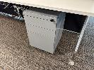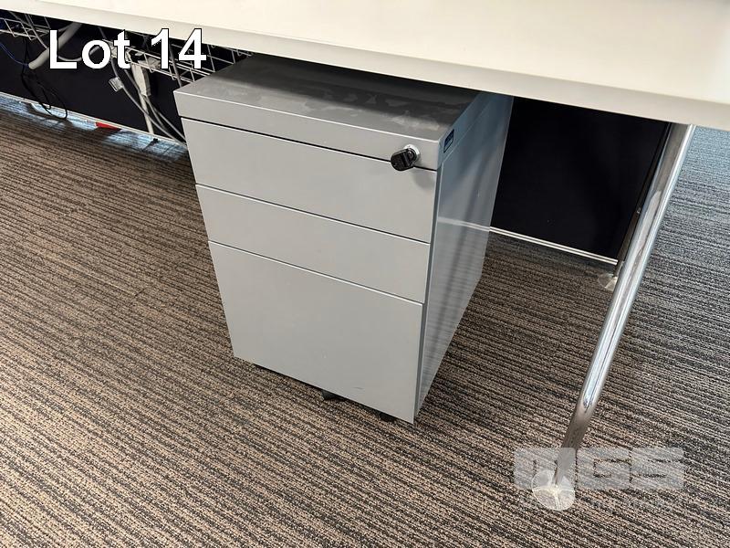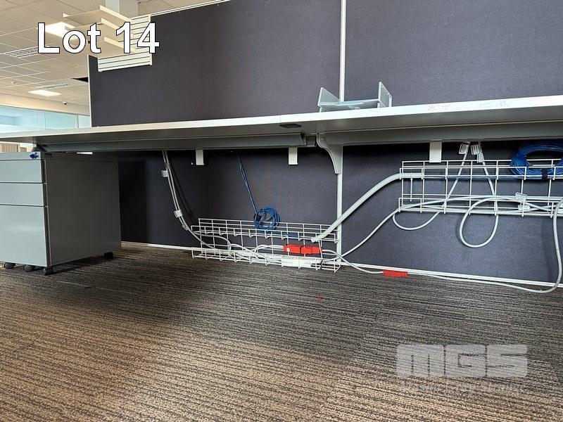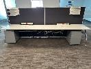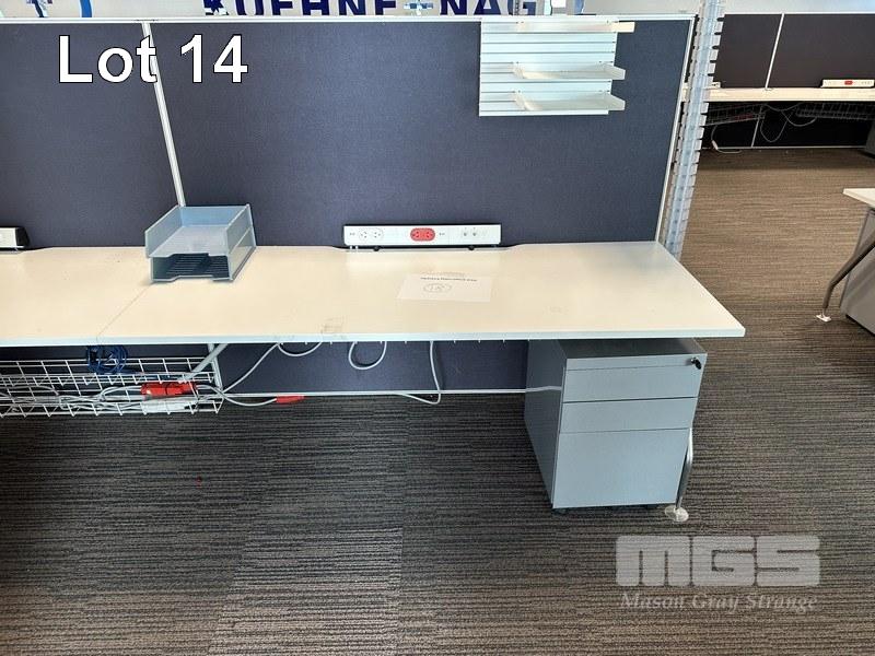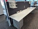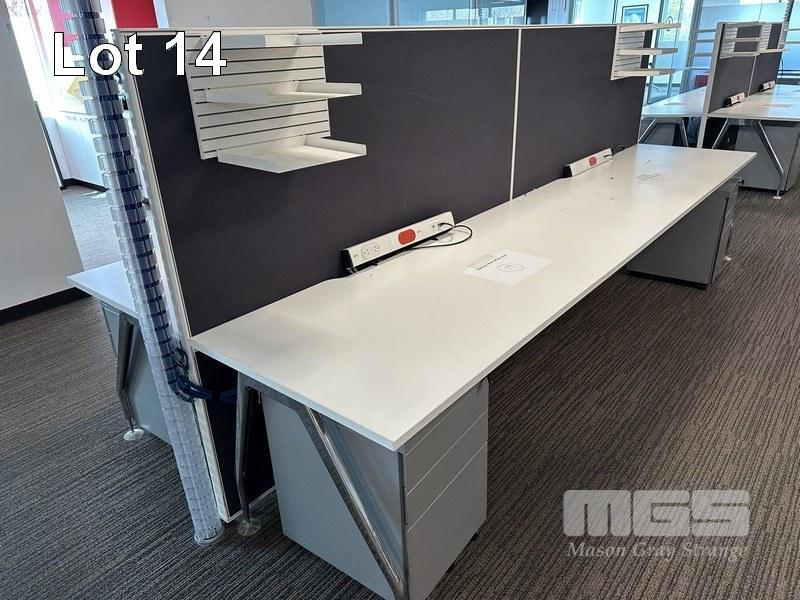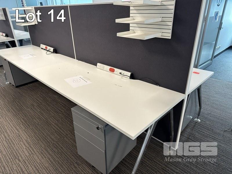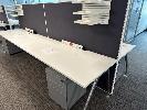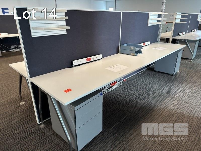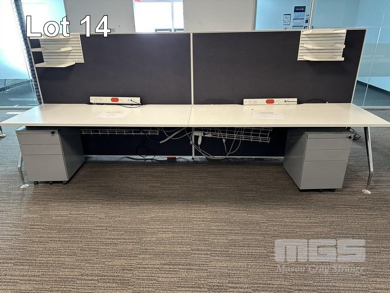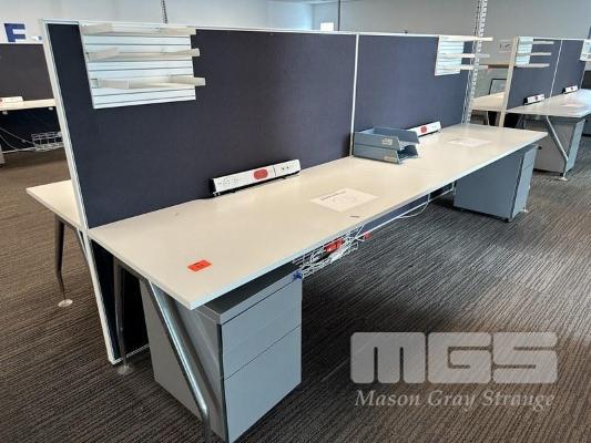 4-PERSON OFFICE WORKSTATION, WHITE LAMINATE, EACH SIDE 360 x 75cm WITH PARTITIONS, 150cm HIGH, SHELF INSERTS & 4 x GREY STEEL UNDERDESK MOBILES (LOCATED LEVEL 1)