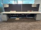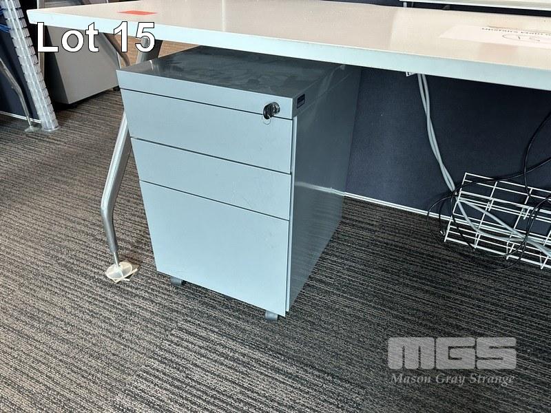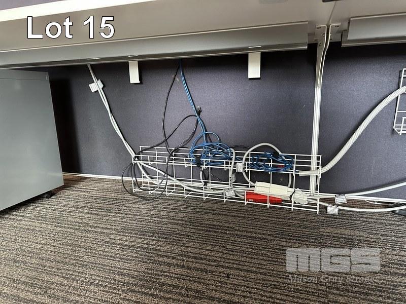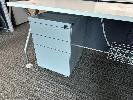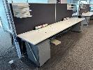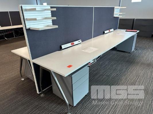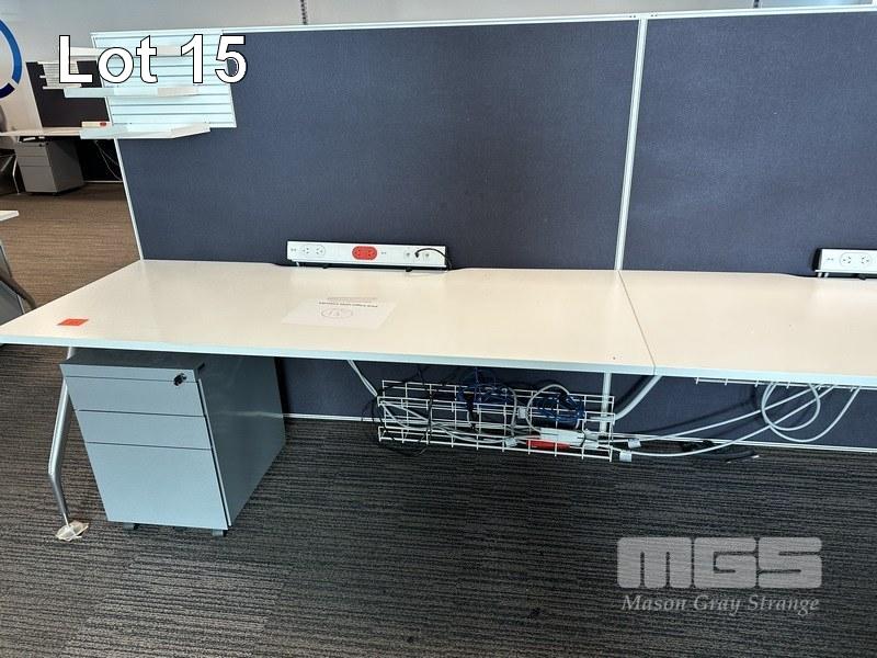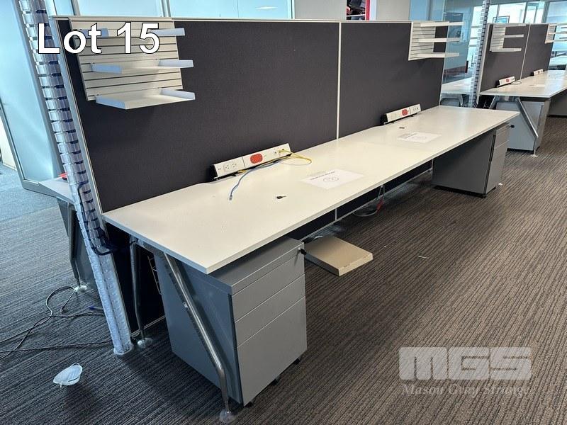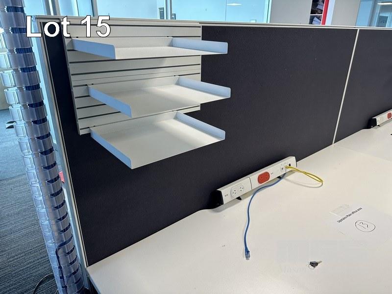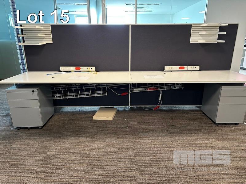4-PERSON OFFICE WORKSTATION, WHITE LAMINATE, EACH SIDE 360 x 75cm WITH PARTITIONS, 150cm HIGH, SHELF INSERTS & 4 x GREY STEEL UNDERDESK MOBILES (LOCATED LEVEL 1)