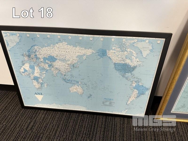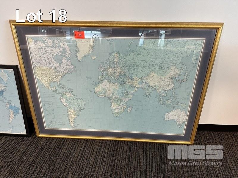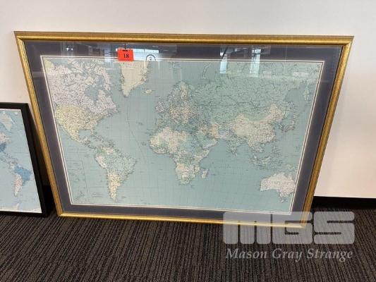 2 x FRAMED WORLD MAPS, 145 x 105cm & 95 x 70cm (LOCATED LEVEL 1)