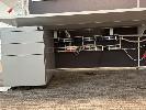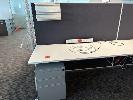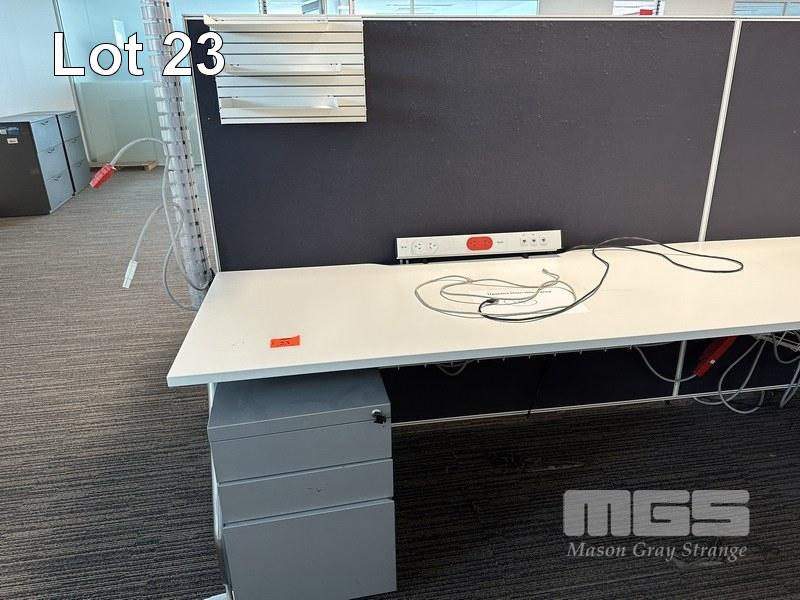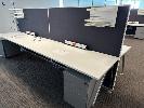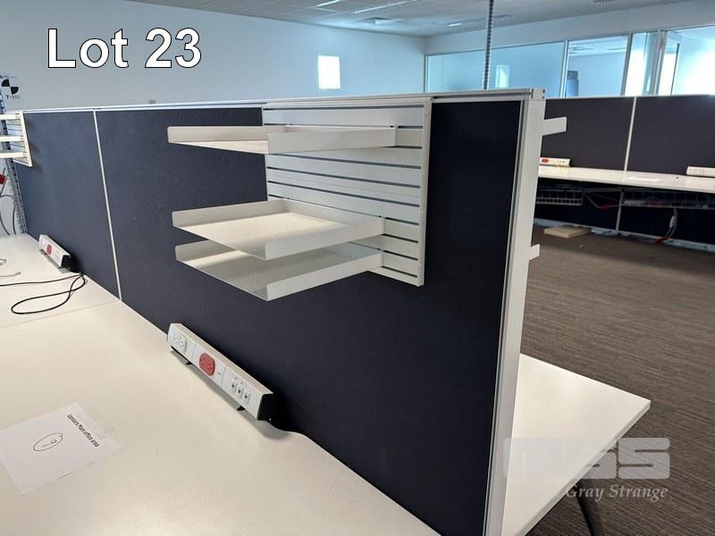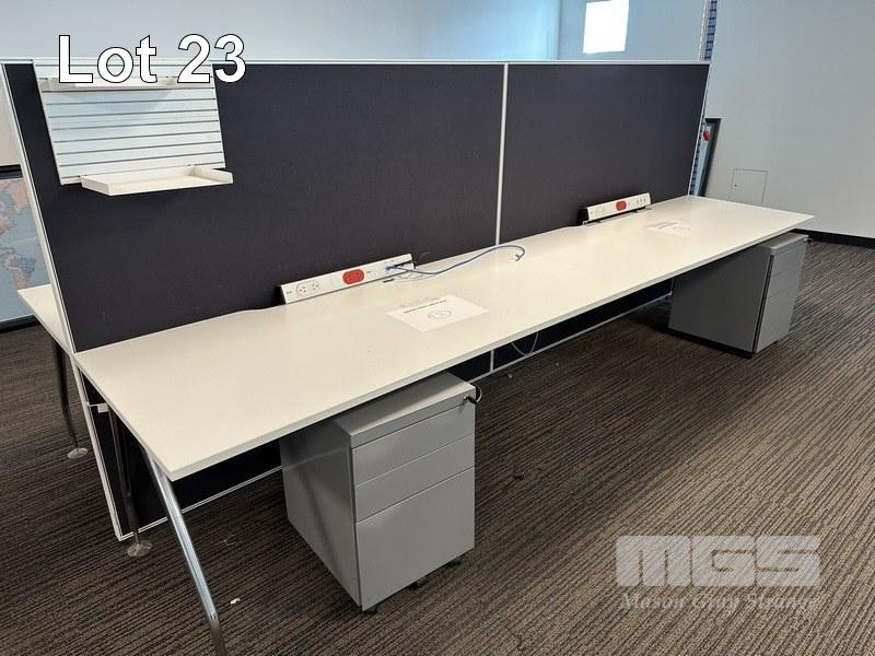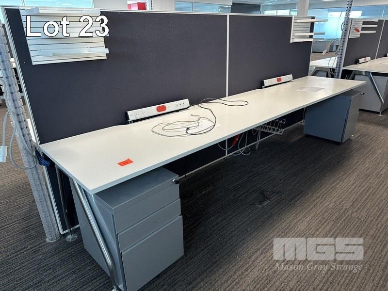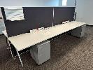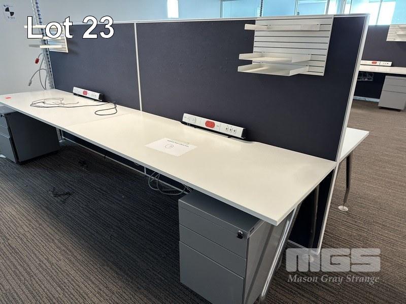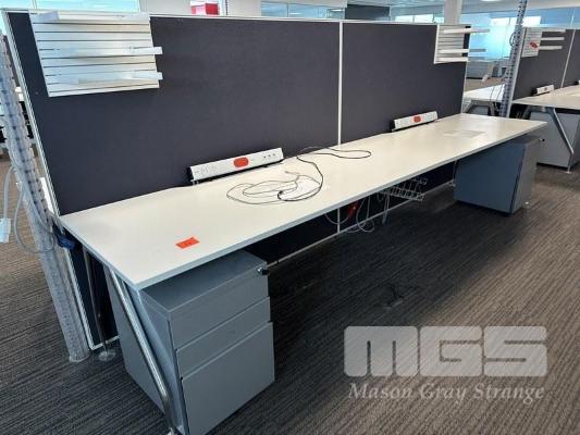 4-PERSON OFFICE WORKSTATION, WHITE LAMINATE, EACH SIDE 360 x 75cm WITH PARTITIONS, 150cm HIGH, SHELF INSERTS & 4 x GREY STEEL UNDERDESK MOBILES (LOCATED LEVEL 1)