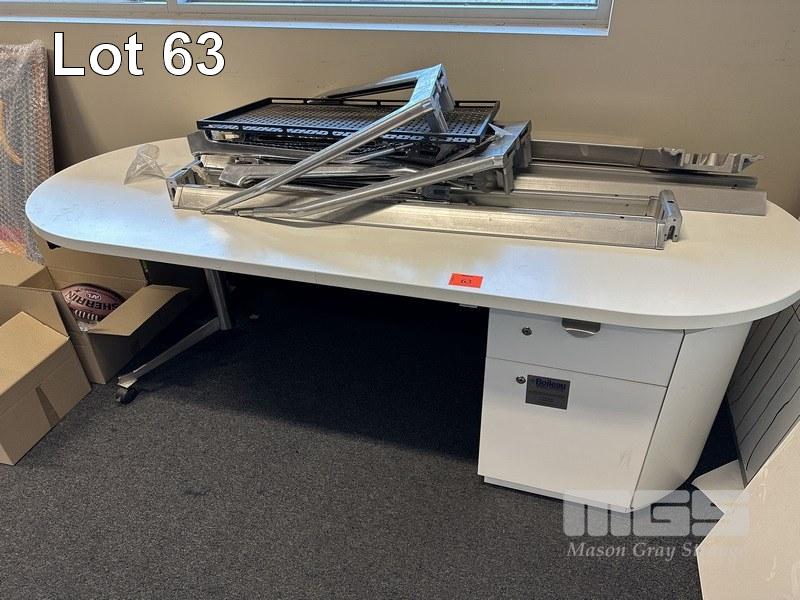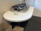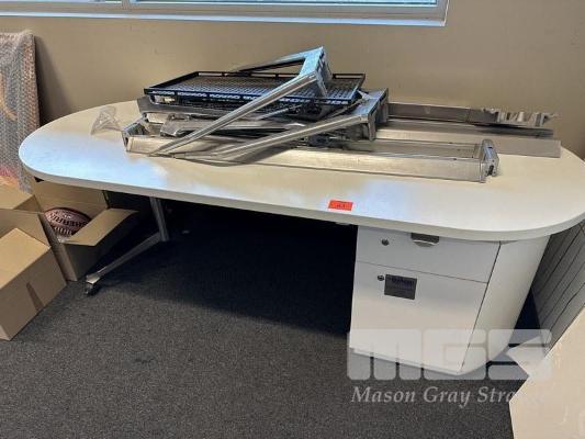 2 x OFFICE DESKS, OVAL SHAPE, WHITE LAMINATE, 220 x 90cm