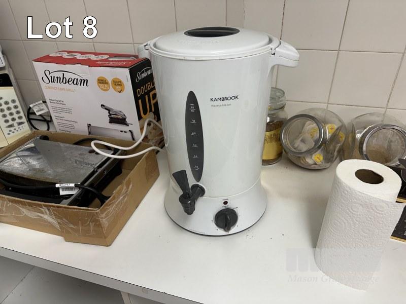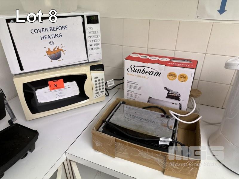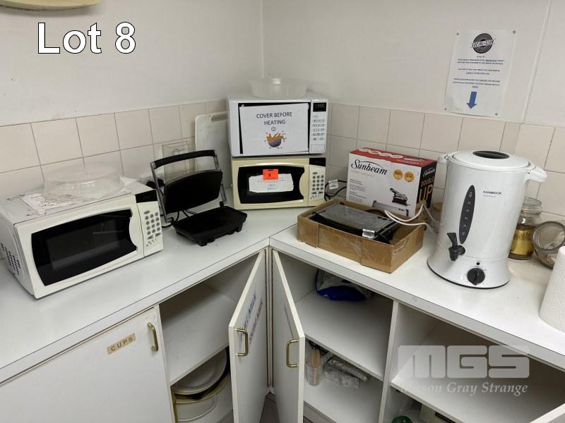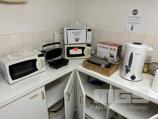 3 x MICROWAVES, 2 x SANDWICH PRESSES, ESPRESSOTORIA COFFEE POD MACHINE, KAMBROOK 8 LITRE URN