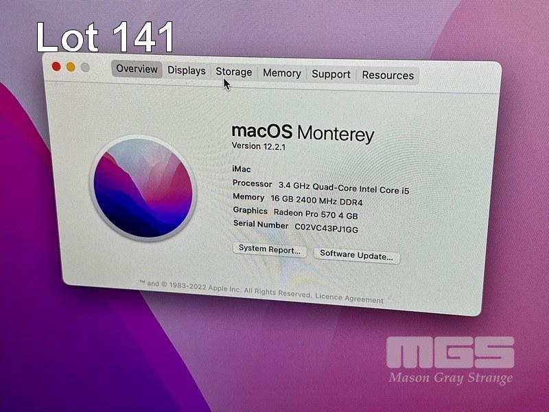 APPLE iMAC 27", A1419, CORE i5 7500 @ 3.4GHz, 16GB RAM, 1TB FUSION DRIVE, 4GB RADEON PRO 570 VIDEO, MAC OS 12 INSTALLED (NO KEYBOARD, NO MOUSE)