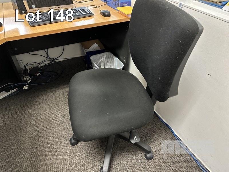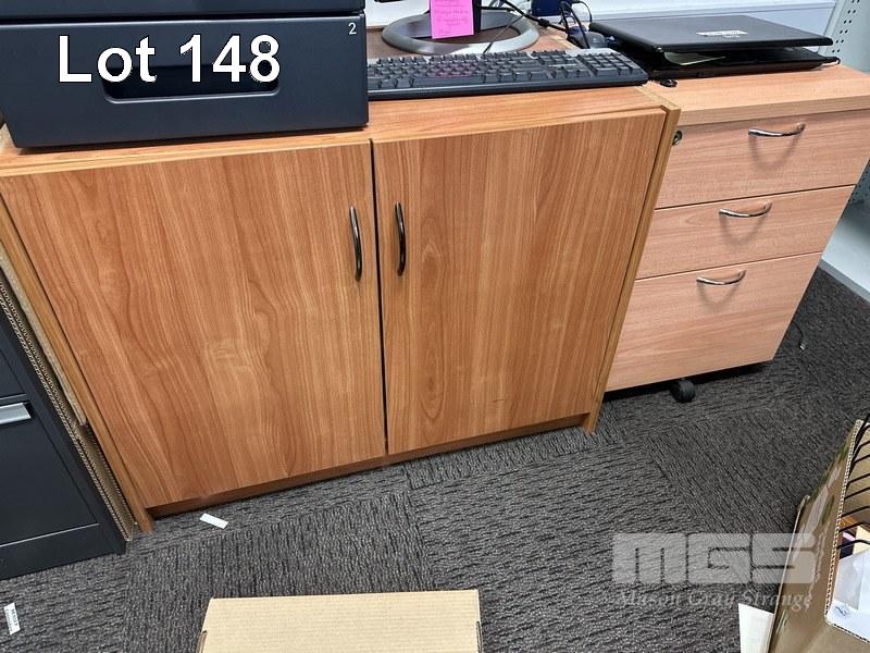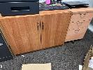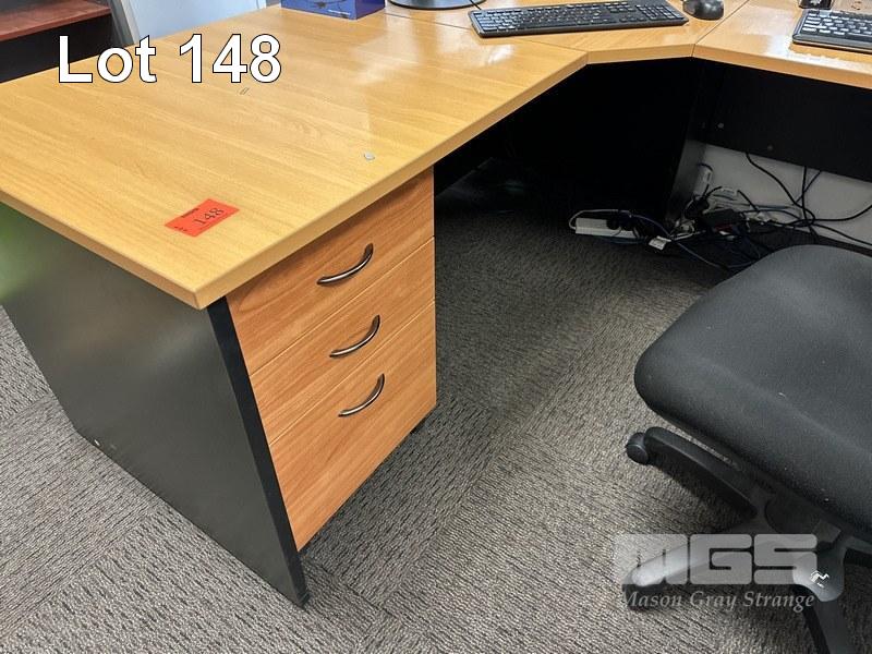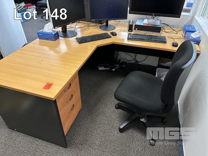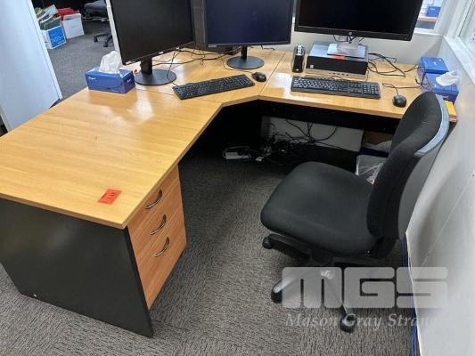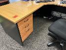 CORNER OFFICE DESK, BEECH / IRONSTONE LAMINATE, 180 x 180 x 75cm WITH 3-DRAWER MOBILE, LOWLINE 2-DOOR CABINET & CHAIR