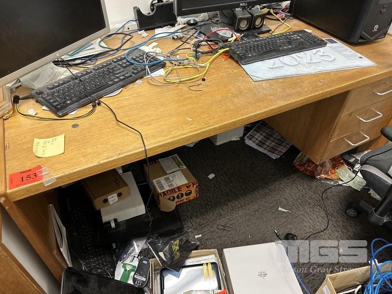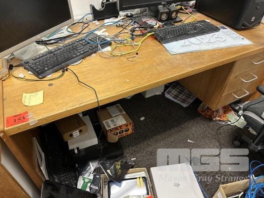 OFFICE DESK, TIMBER, 170 x 90cm, LOWLINE SHELF UNIT & CHAIR