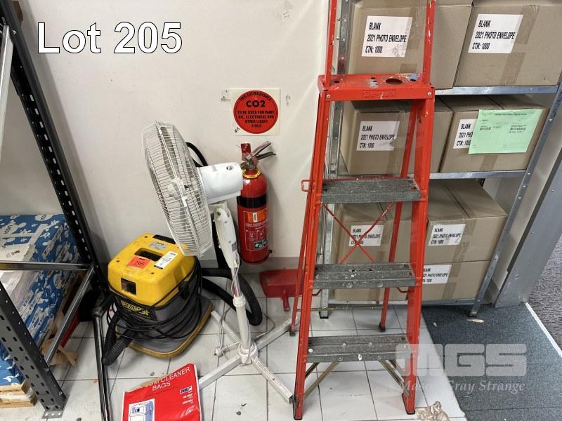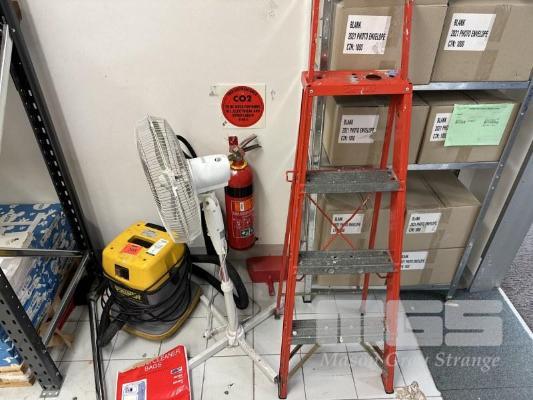 PULLMAN AS5 VACUUM CLEANER, PEDESTAL FAN, LADDER & 2 x GALV SHELF UNITS