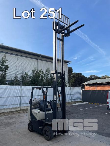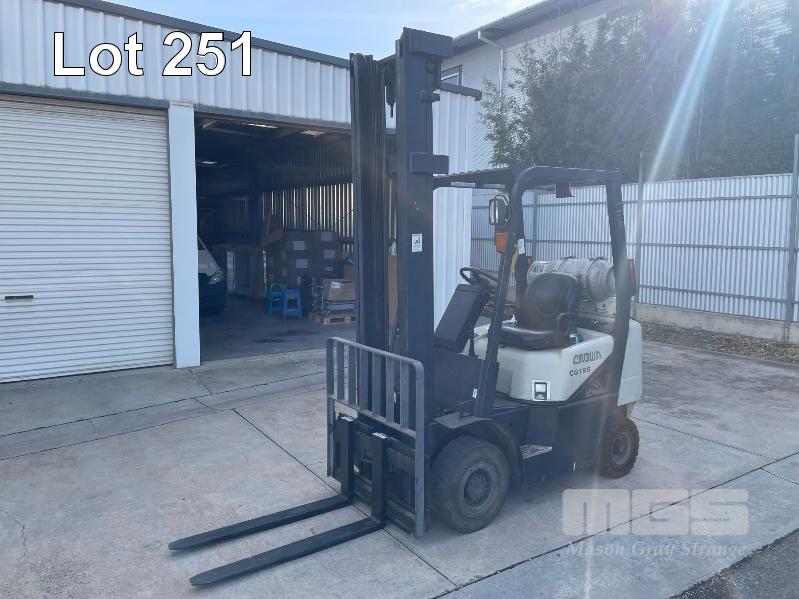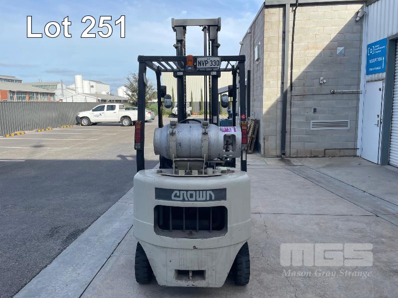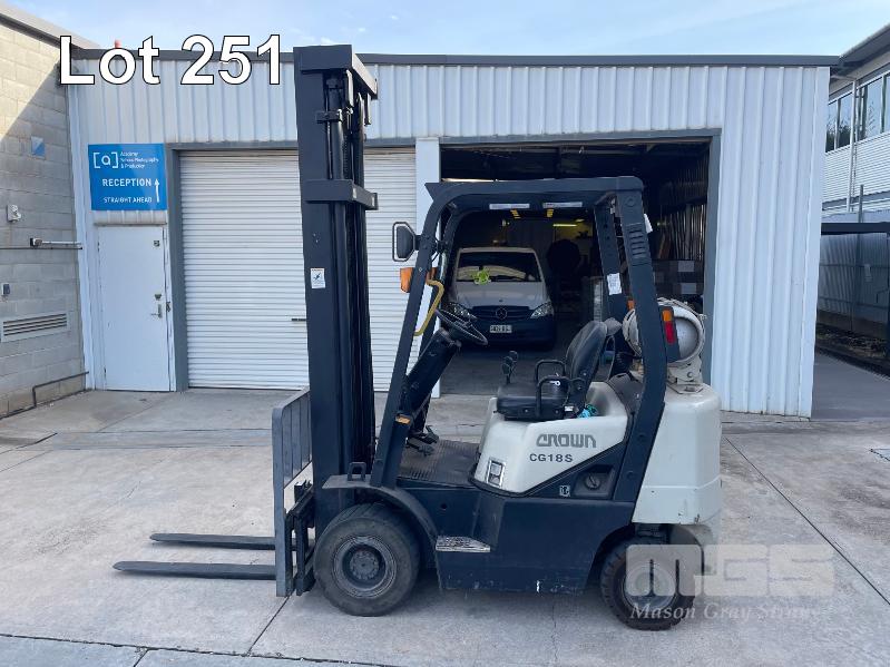 CROWN 1.5 TONNE FORKLIFT, MOD: CG18S-2, DOM: 2000 SERIAL: DH-00037, HOURS: 2,998 TILT & SIDESHIFT, SOLID TYRES, LPG, 2 STAGE MAST, MAX LIFT: 4500mm, MAST: 2800mm (H) LIFT CAP: 1,470kg, REGO: NVP 330