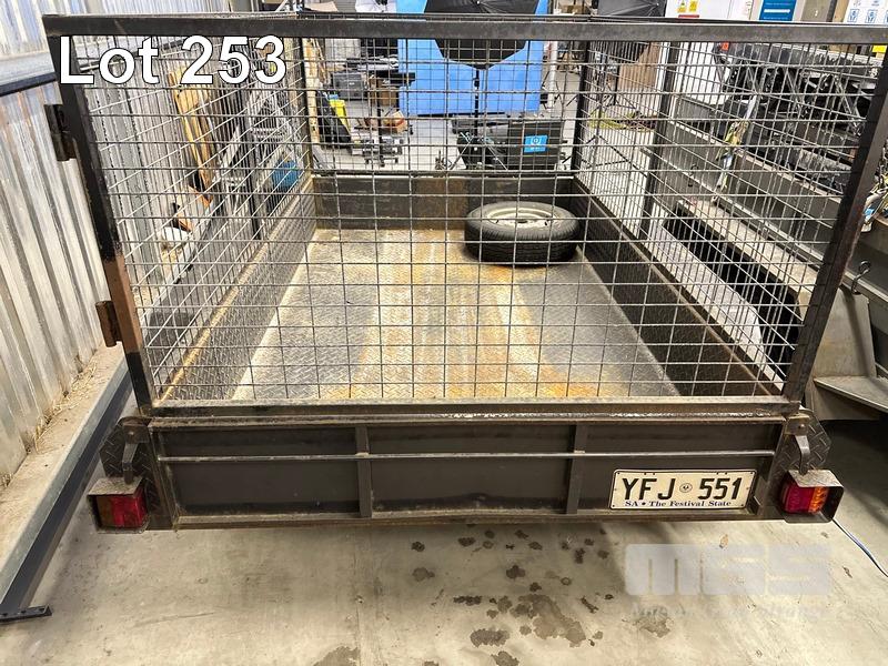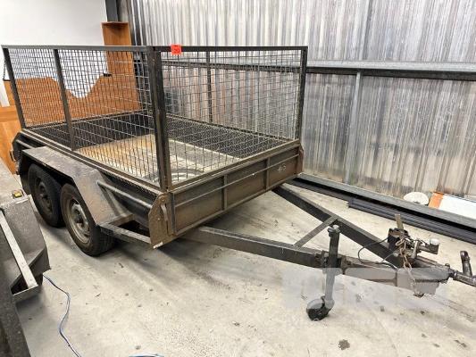 MODERN TRAILER TANDEM AXLE CAGED TRAILER, 8 x 5ft VIN: 6N4MODERN3TC09621 GTM: 1990kg DOM: 2004 REGO: YFJ551 STEEL WHEELS WITH SPARE DROP FRONT & REAR 50mm COUPLER (NO PAPERS)