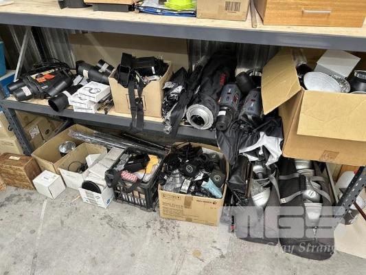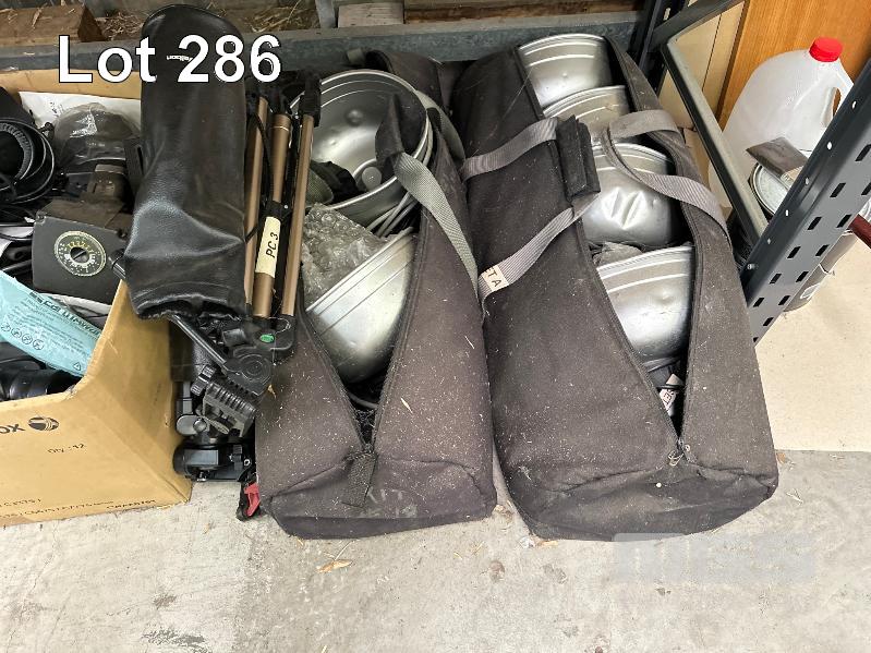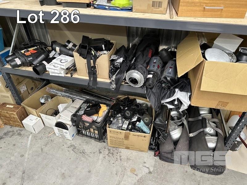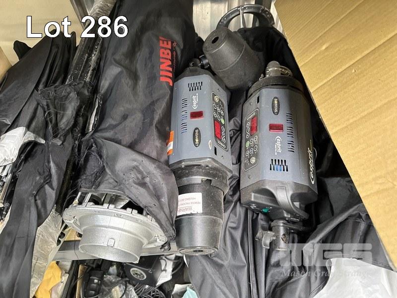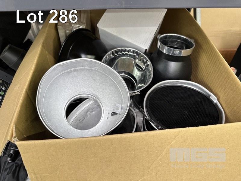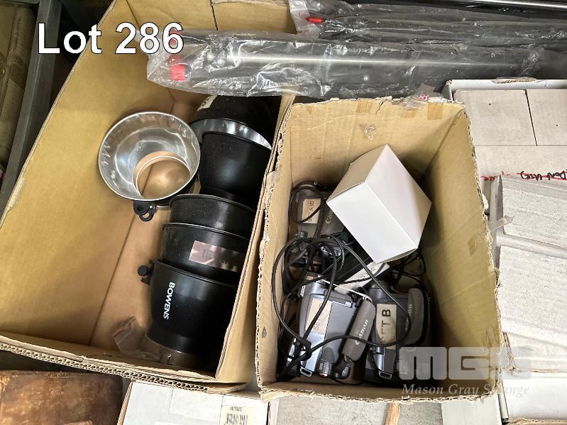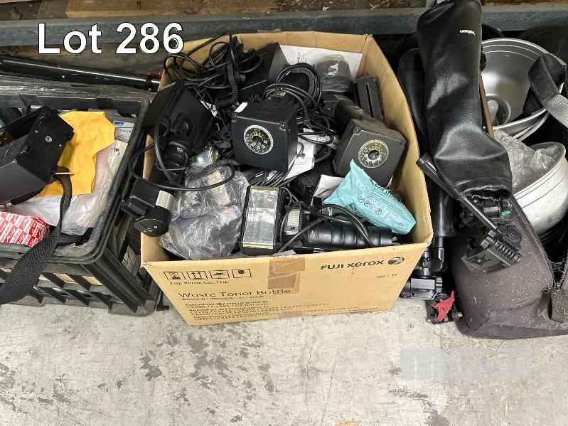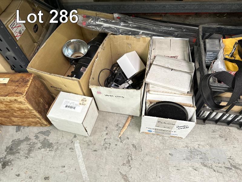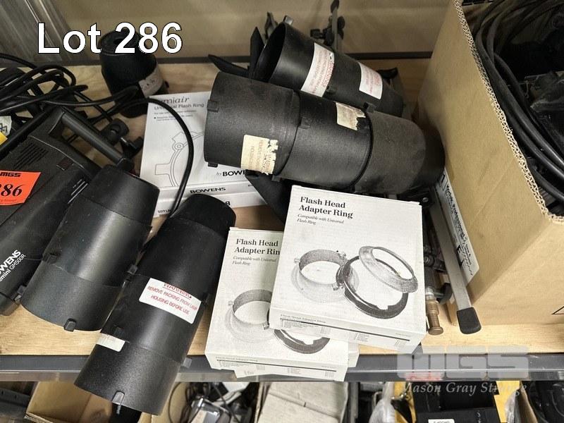 QTY BOWENS LIGHTING (2 x FAULTY LIGHTS), ADAPTER RINGS, SOFTBOXES, UMBRELLAS, REFELCTOR HOODS, HONEY COMBS, ETC