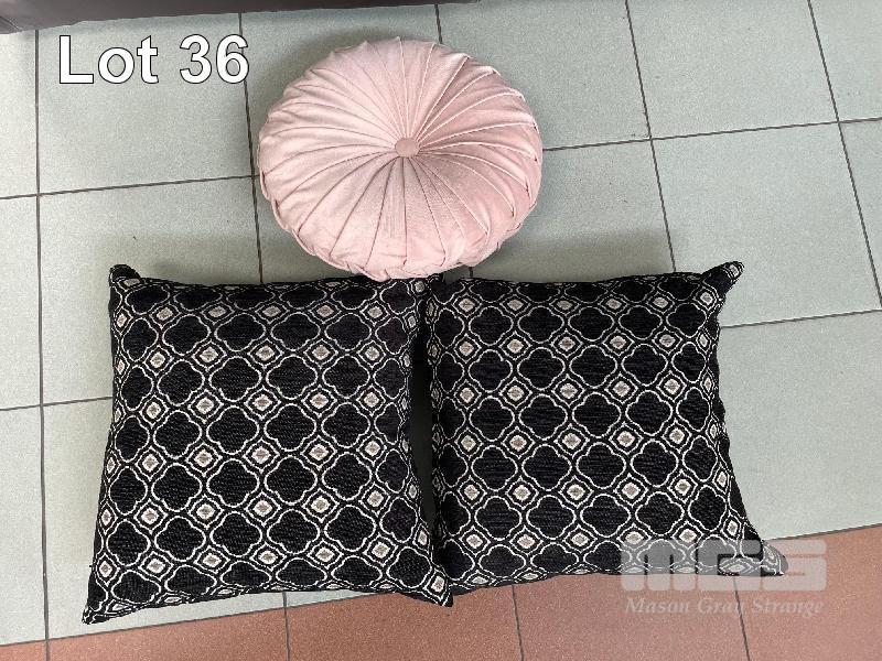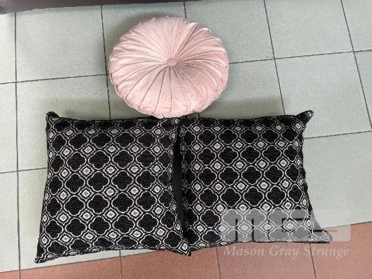 SET OF 3 THROW CUSHIONS, PINK & BLACK/WHITE CLOTH