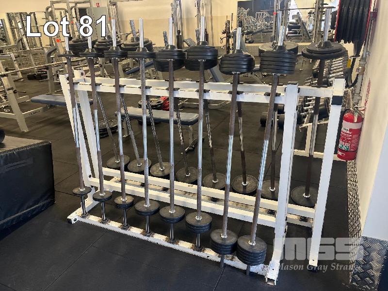 PAIR OF BARBELL RACKS WITH 16 x AUSTRALIAN BARBELL CO. BARBELLS, 10 TO 50kg