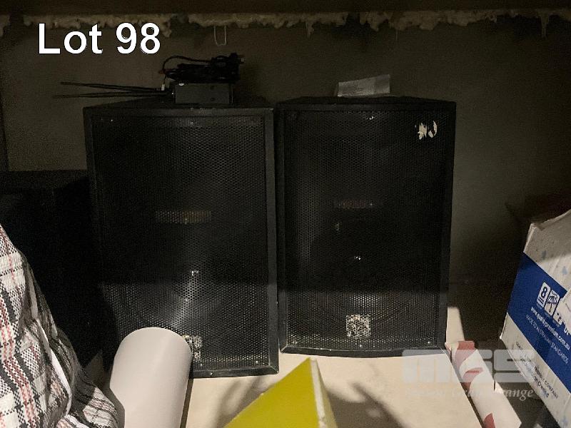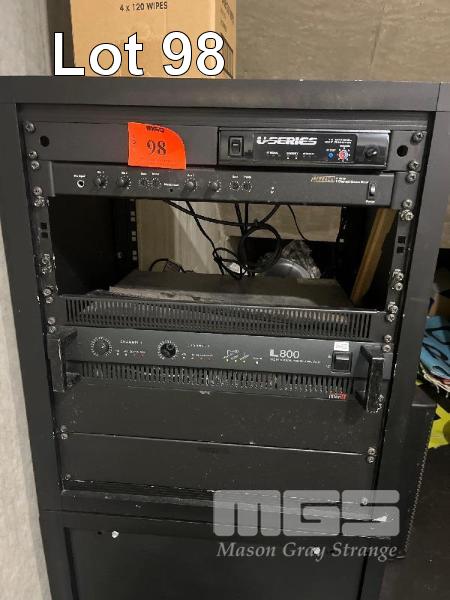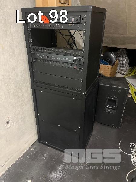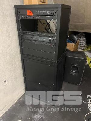 AV RACK, 2 CHANNEL AMP, 4 CHANNEL STEREO MIXER, 5 x DAS SPEAKERS, 1 x WIRELESS RECEIVER ALL CONDITION UNKNOWN