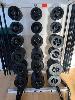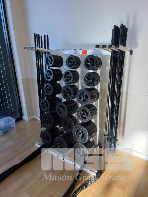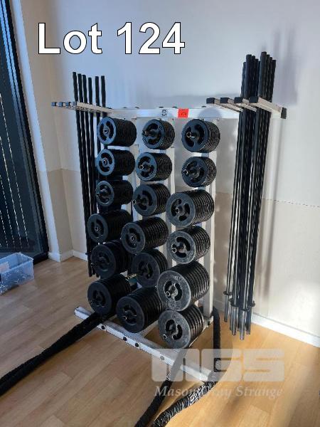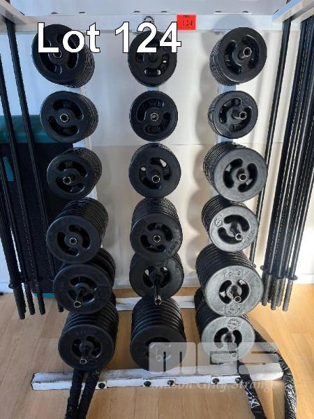 AUSTRALIAN BARBELL CO. PUMP WEIGHT SET, 15 x BARS, 120 x PLATES FROM 1.25 TO 5kg & STORAGE RACK