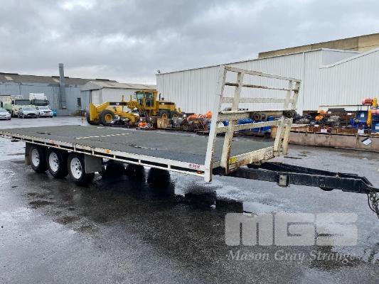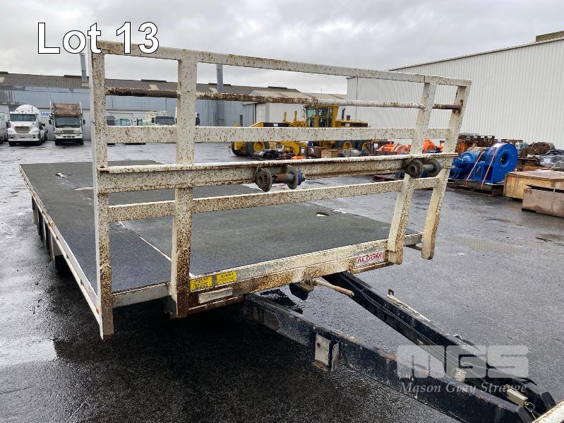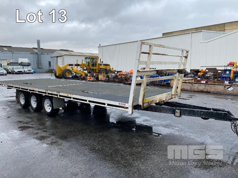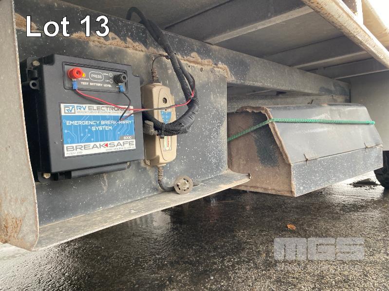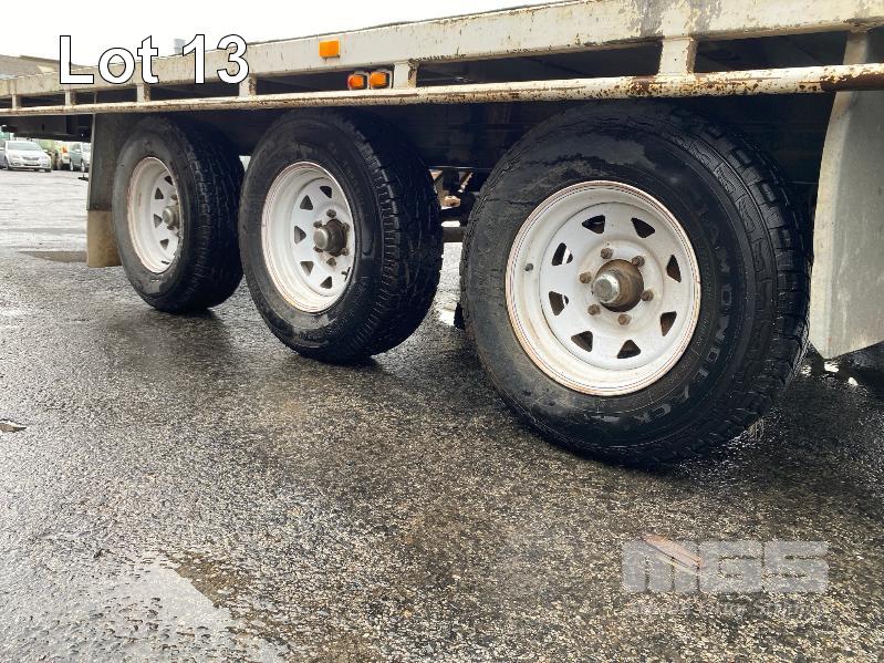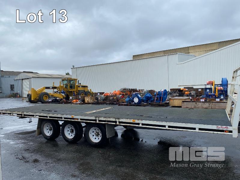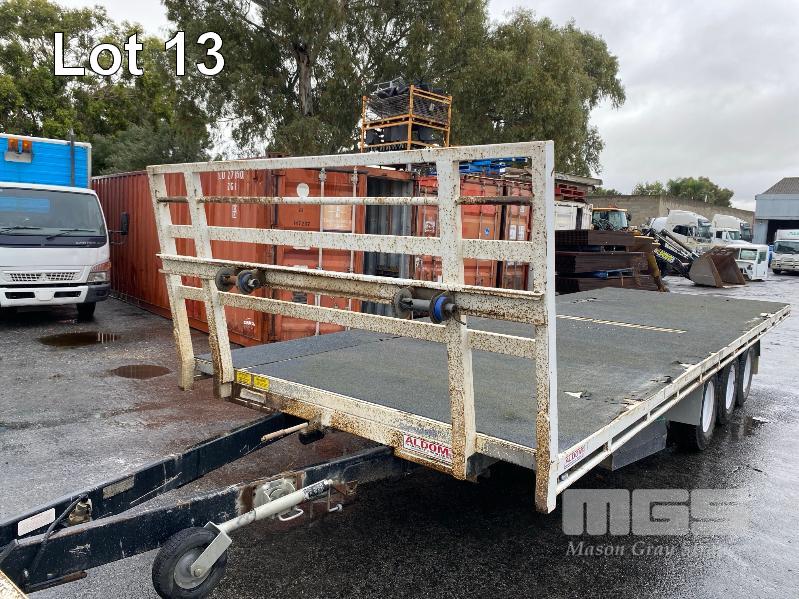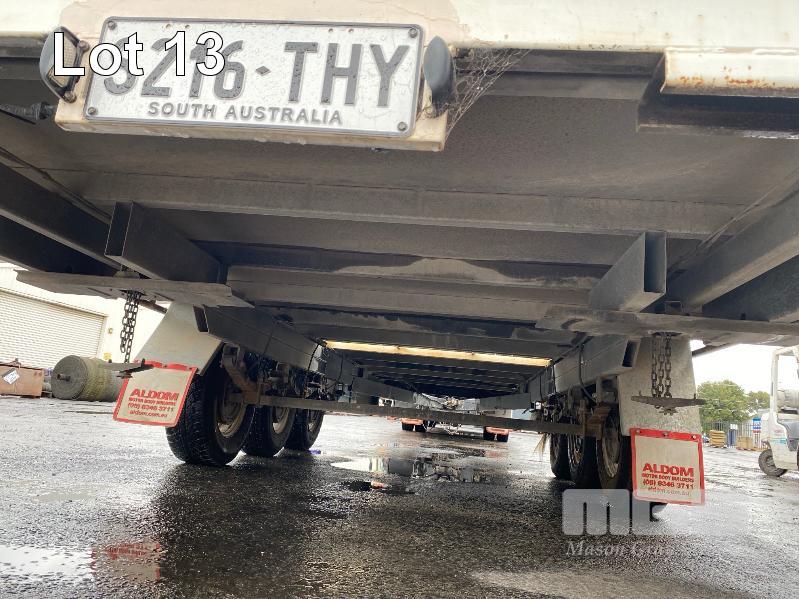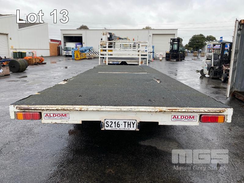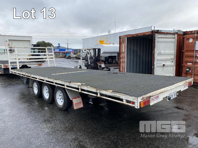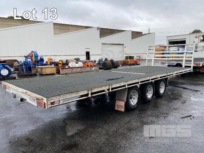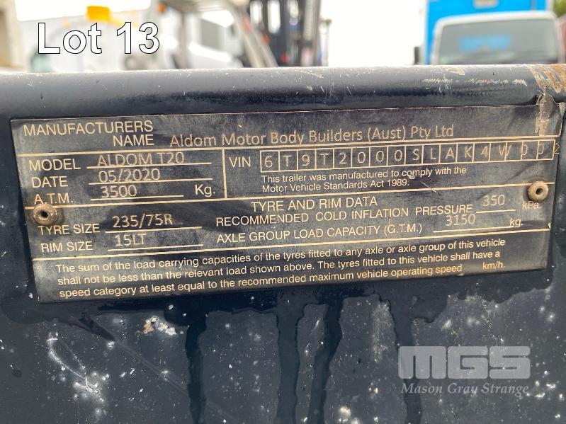 2020 ALDOM 25' TRI AXLE FLAT TOP TRAILER MODEL: ALDOM T20 REG: S216 THY VIN / CHASSIS: 6T9T2000SLAK4W002 ATM: 3,500kg SPRING SUSPENSION, STEEL RIMS, 235/75R15, DRUM BRAKES, RING FEEDER, GTM: 3,150kg TRAY TOP SIZE: 7500 x 2500mm FITTED WITH BREAK SAFE ELECTRONIC BRAKING SYSTEM UNDER TRAY TOOLBOX 1 x FRONT GATE