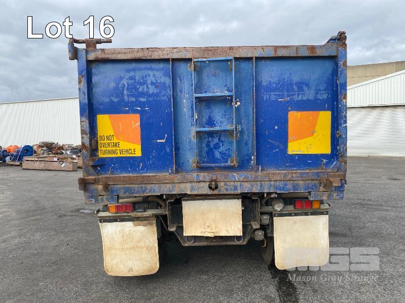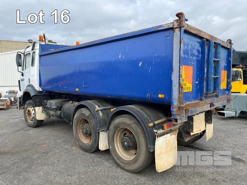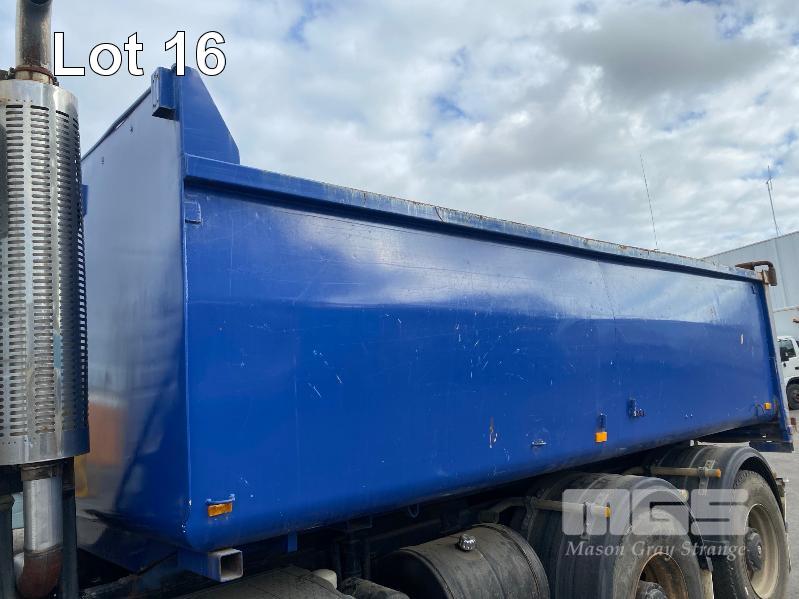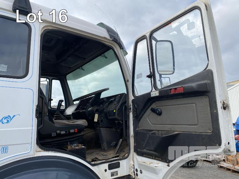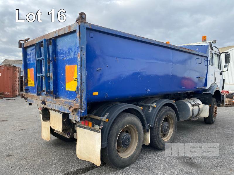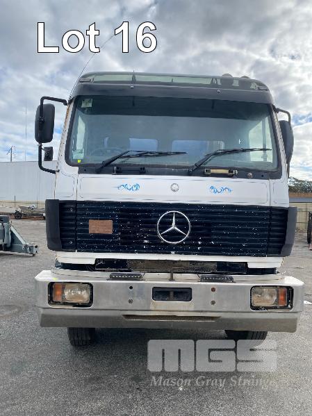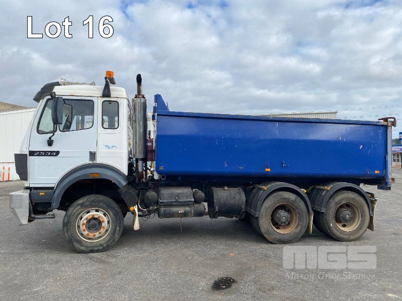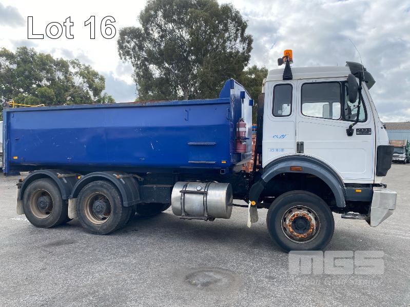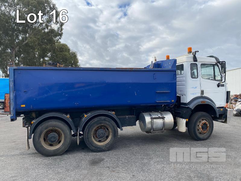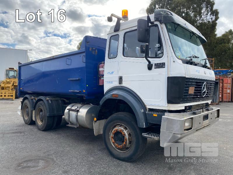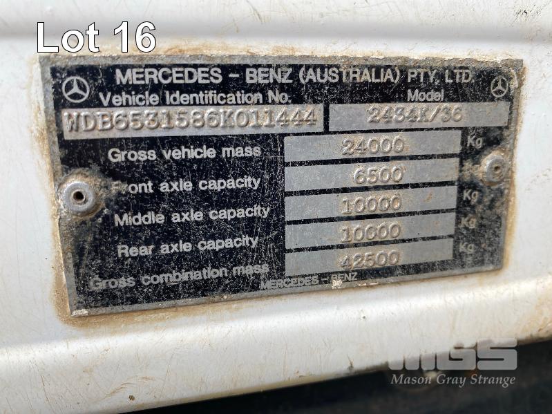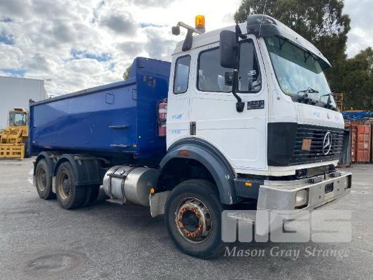 1993 MERCEDES BENZ 2434K/36 SUPER CLASS 6x4 SINGLE CAB TIPPER REG: NO PLATES VIN: WDB6531586K011444 ENG: OM441986207331 ODO: 844,205kms SHOWING GVM: 24,000kg GCM: 42,500kg MERCEDES BENZ, V6 TURBO DIESEL, EATON FULLER MANUAL TRANSMISSION, SPRING SUSPENSION, WHITE/BLUE DUCO, 11R22.5 TYRES, 2 DOORS, 2 SEAT, AIR CON, HYDRAULICS, STEEL RIMS, TIPPER HOIST CONTROLS, TIPPER BODY HAS SUPPORT LEGS FOR REMOVAL & INCLUDES TURNTABLE 2 WAY RADIO STEEL TIPPER BODY SIZE:4900 x 2400 x 1200mm(H) WITH 2 WAY TAILGATE KEY #39 (WITH 1 KEY/S)