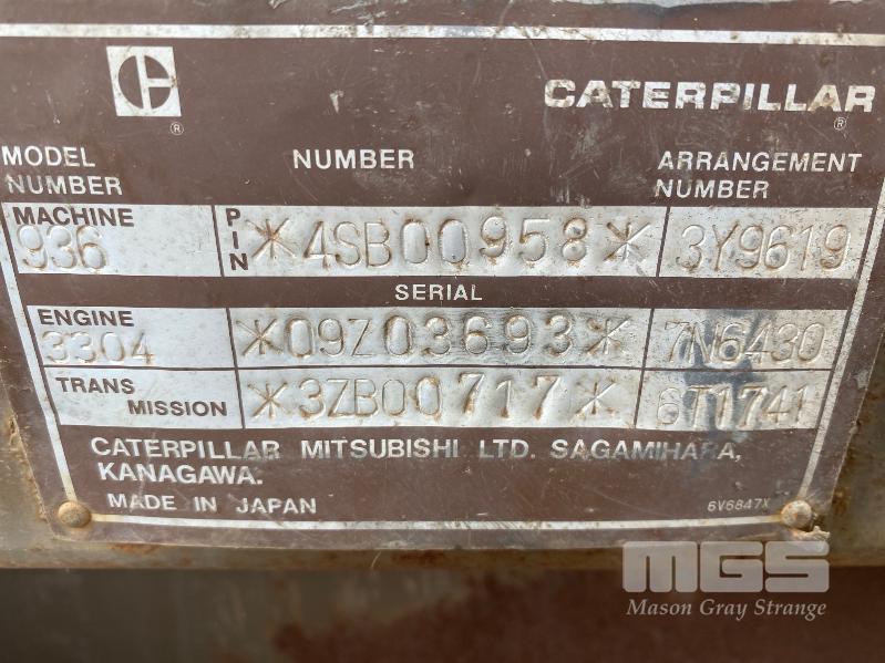 CATERPILLAR 936E ARTICULATED WHEEL LOADER, PIN: 4SB00958 HOURS: 23,454 4 CYLINDER TURBO DIESEL ENGINE: 3304 *09703693* 7N6430 TRANS: *37B00717* 6T1741 ENCLOSED A/C CABIN, ROPS WITH FORK TYNE ATTACHMENT 1200mm(L) (ENGINE REBUILT 250HRS ONLY) KEY #75