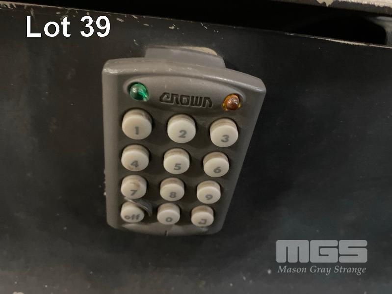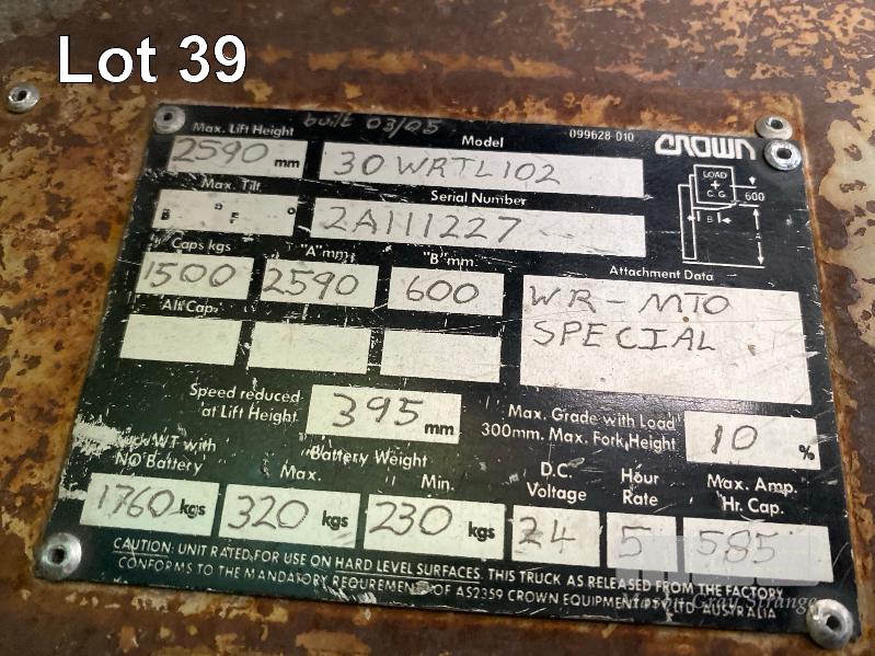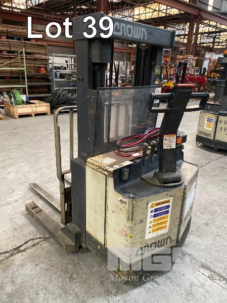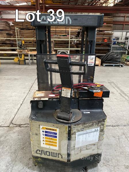 ELECTRIC WALKIE STACKER REACH FORK CROWN, MOD: 30WRTL102 S/NO: 2A111227 HOURS: 938 SHOWING LIFT CAP: 1,500kg MAX LIFT HEIGHT: 2,590kg KEYPAD LOCKOUT, CODE (1648 ENTER) WITH CHARGER & CABLE