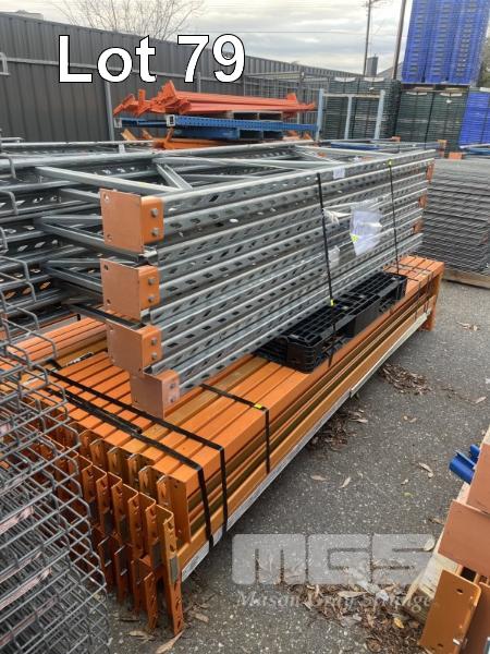 QTY OF COLBY HEAVY DUTY LONGSPAN RACKING 7 @ 2400 (H) x 840mm (D) FRAMES - GALVANISED 60 @ 2590 x 55mm ORANGE BEAMS 60 @ 1250 x 840mm (D) MESH DECKS - 2 SUPPORTS 2 x PACKS