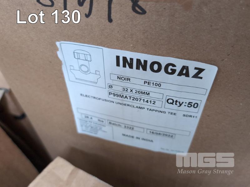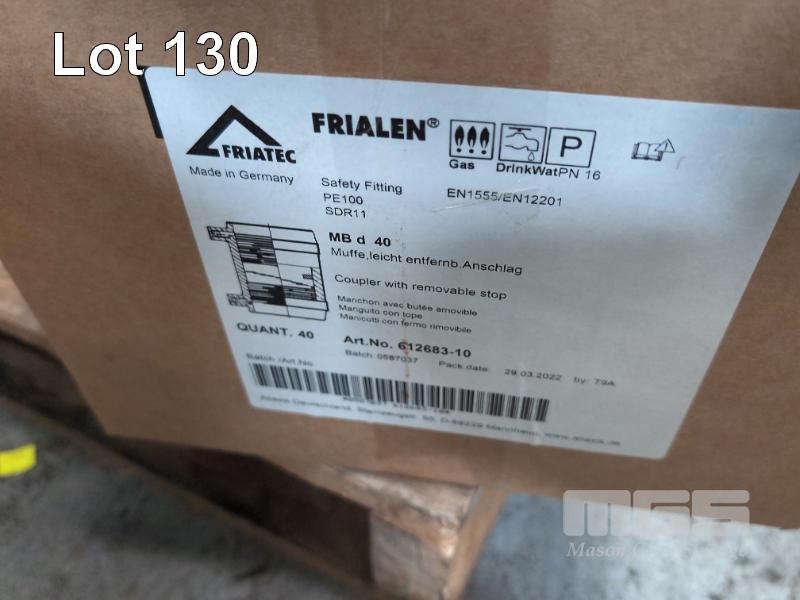 11 X CARTONS ASSORTED HDPE GAS FITTINGS, INCLUDES POLYTEC VALVES, FRIATEC PRESSURE TAPPING TEES, FRIATEC ELECTROFUSION PRESSURE CAPS, COUPLERS, & REDUCERS, INNOGAZ TAPPING TEES ETC (1 X PALLET)