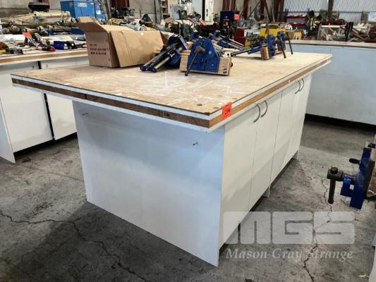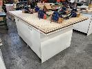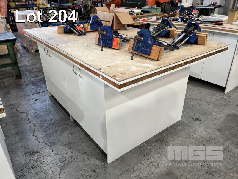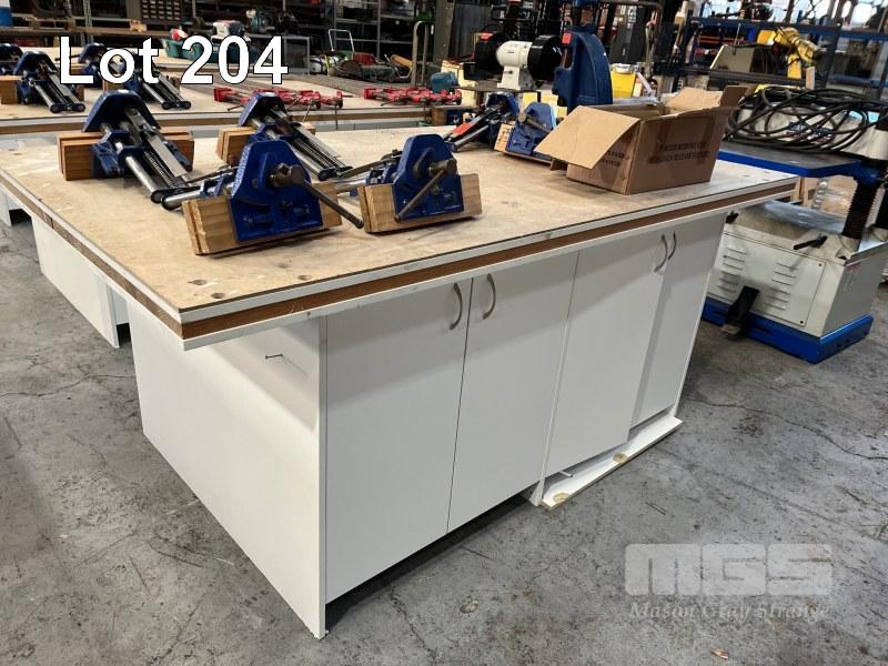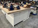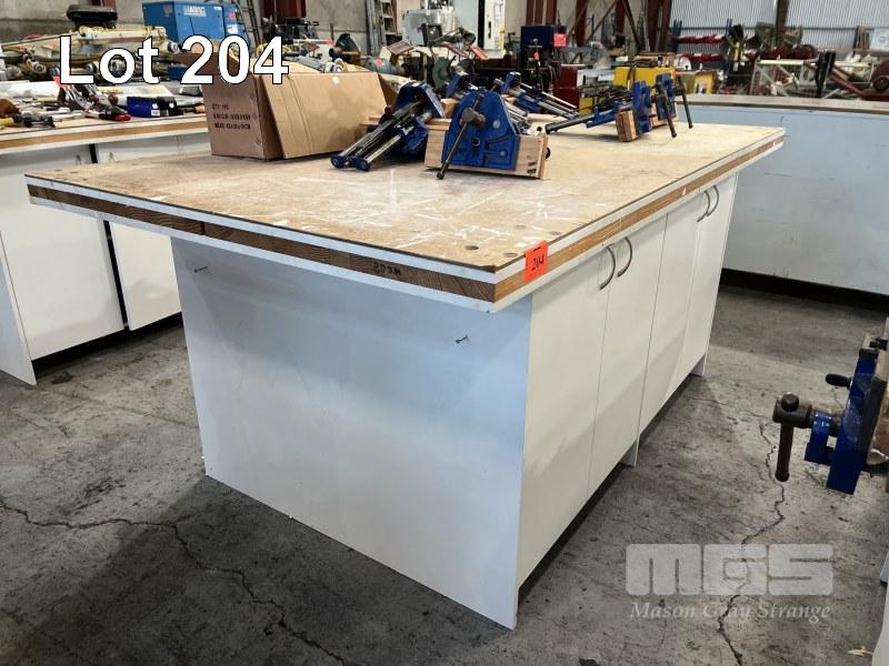 TIMBER WORK BENCH 2100 x 1200 x 900mm 9h) SOLID TIMBER TOP, TIMBER LAMINATE BASE 4 x UNDERBENCH CUPBOARDS