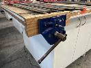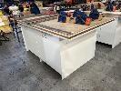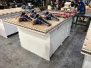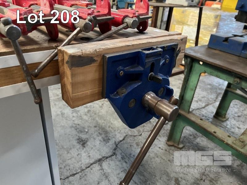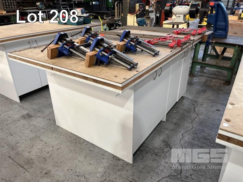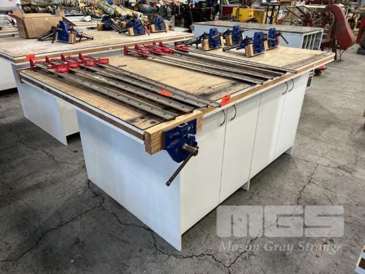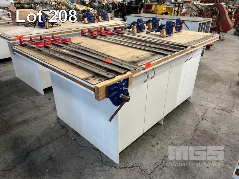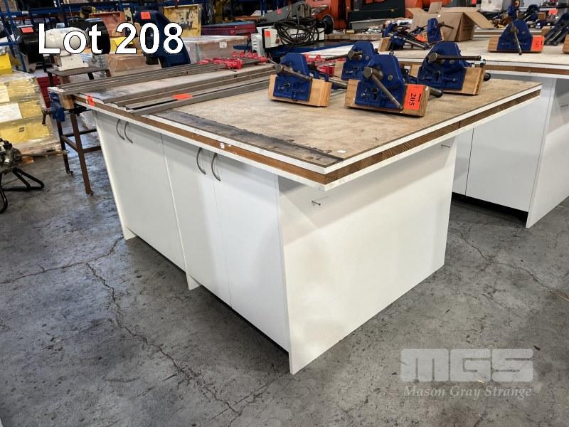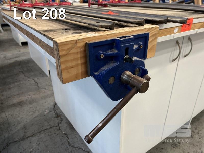 TIMBER WORK BENCH 2100 x 1200 x 900mm 9h) SOLID TIMBER TOP, TIMBER LAMINATE BASE 4 x UNDERBENCH CUPBOARDS FITTED WITH 2 x 180mm WOOD VICES (1 x LEG SIDE DETACHED)