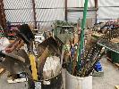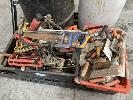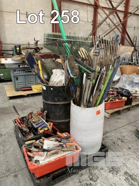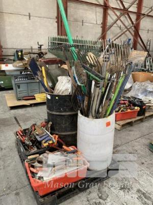 2 DRUMS OF SHOVELS, PITCH FORKS, RAKES, HOES, BROOMS, POST HOLE DIGGER, 1 x TUB WITH HAND TOOLS, INCLUDING CONCRETE FINISHING TOOLS & 1 x TUB OF SAWS, CAULKING GUNS, HACK SAWS, ETC, 1 x PALLET