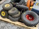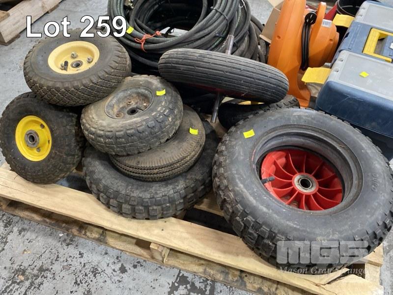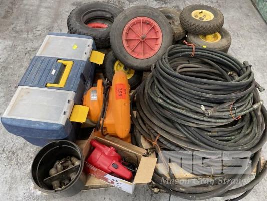 2 x BLOWER UNITS, 240 & 12V, HYDRAULIC HOSES WITH FITTINGS, ASSORTED SIZES, TOOLBOX & ASSORTED WHEELS, SUIT WHEELBARROWS, TROLLIES, ETC 1 x PALLET