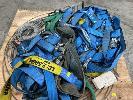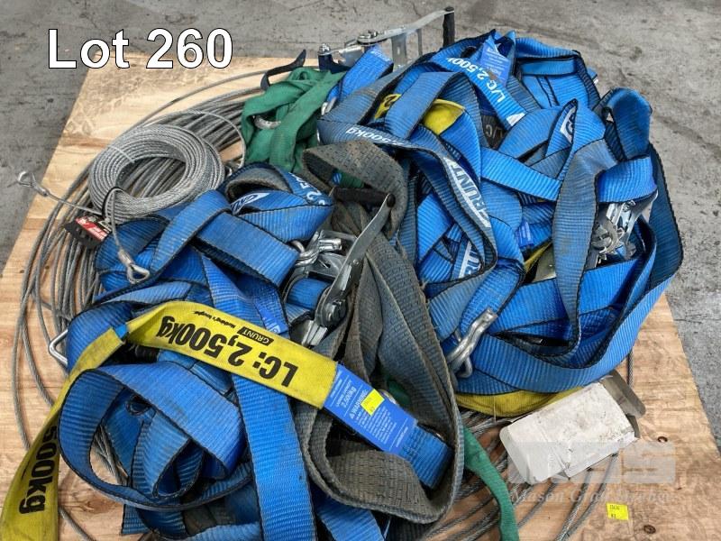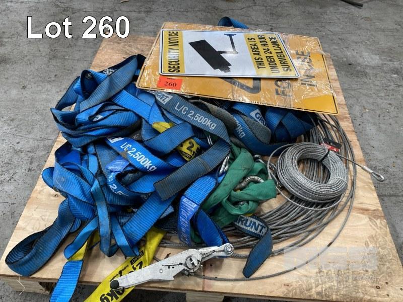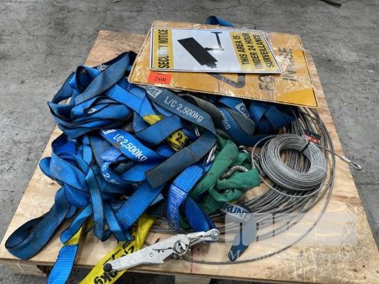 3 X LENGTHS GALVANISED WIRE ROPE AND ASSORTED HEAVY DUTY RATCHET STRAPS AND ASSORTED SAFETY SIGNS (1 X PALLET)