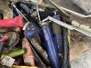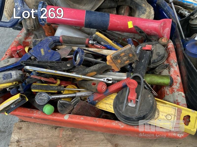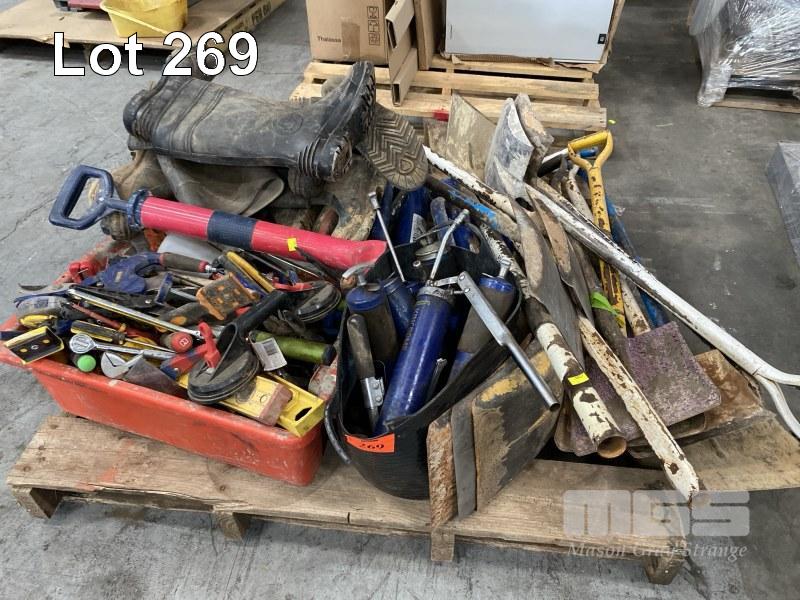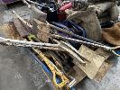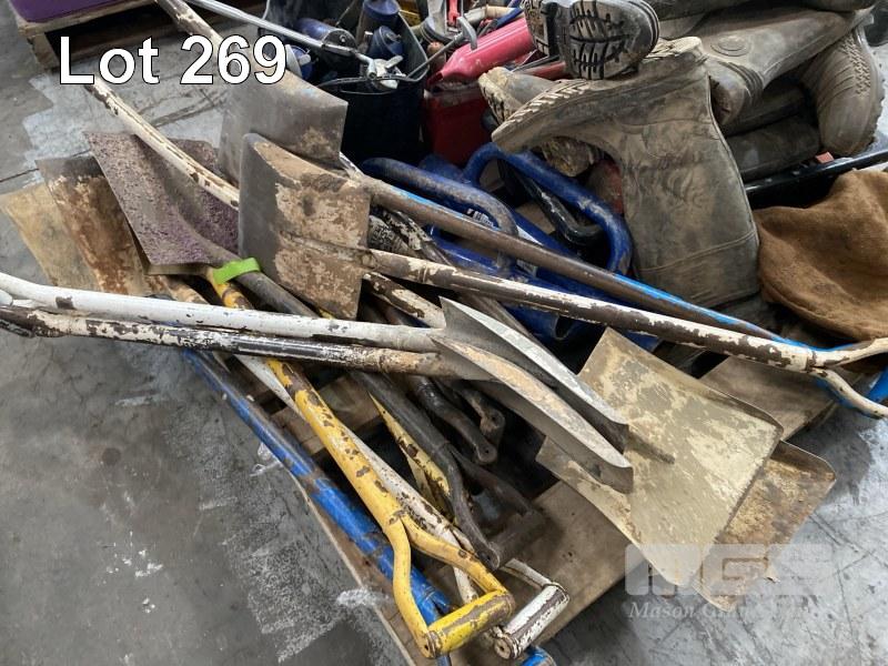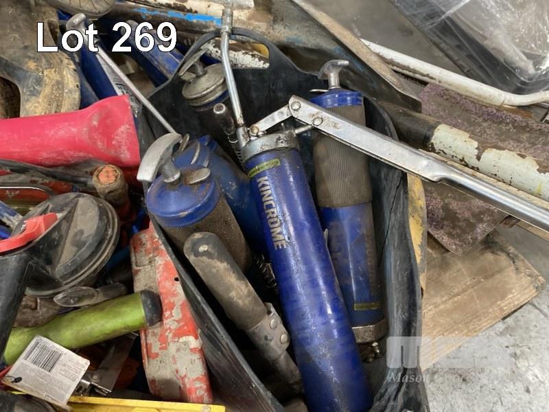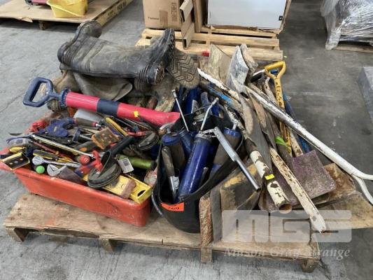 9 x GREASE GUNS, 1 x TUB ASSORTED HAND TOOLS, SHOVELS, POST/STAR DROPPER RAMMERS, GUM BOOTS, ETC 1 x PALLET
