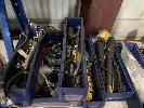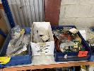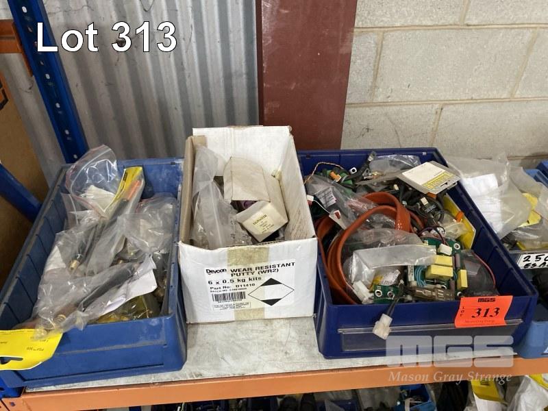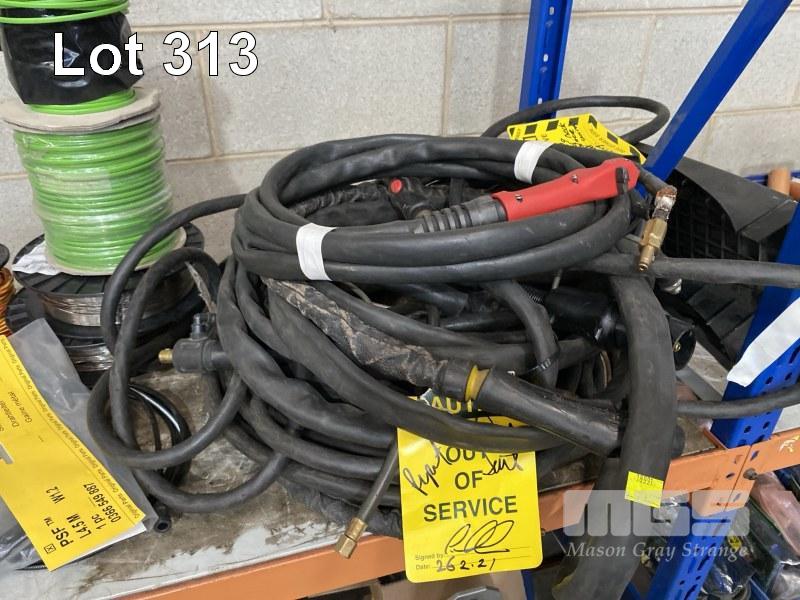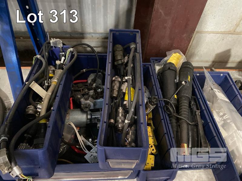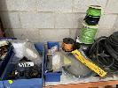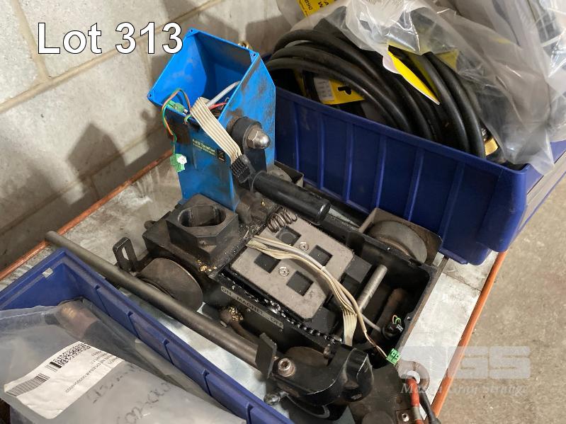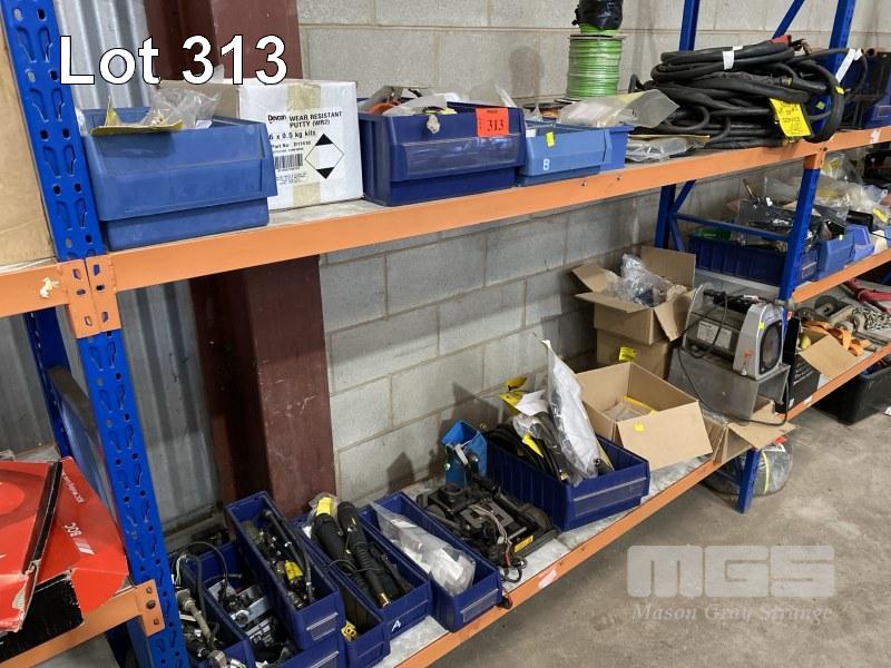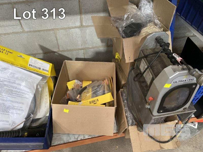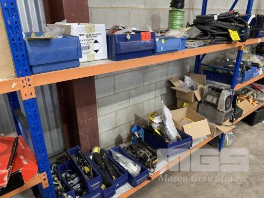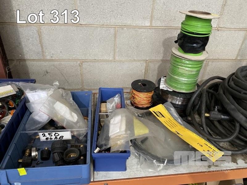 MIG WELDING ACCESSORIES & PARTS INCLUDING LEADS, HAND PIECES, COMPONENTS, LINERS, WELDING TROLLEY, ALL FAULTS, PLUGS, FITTINGS, ETC IN PARTS DRAWERS & BOXES 2 x SHELVES